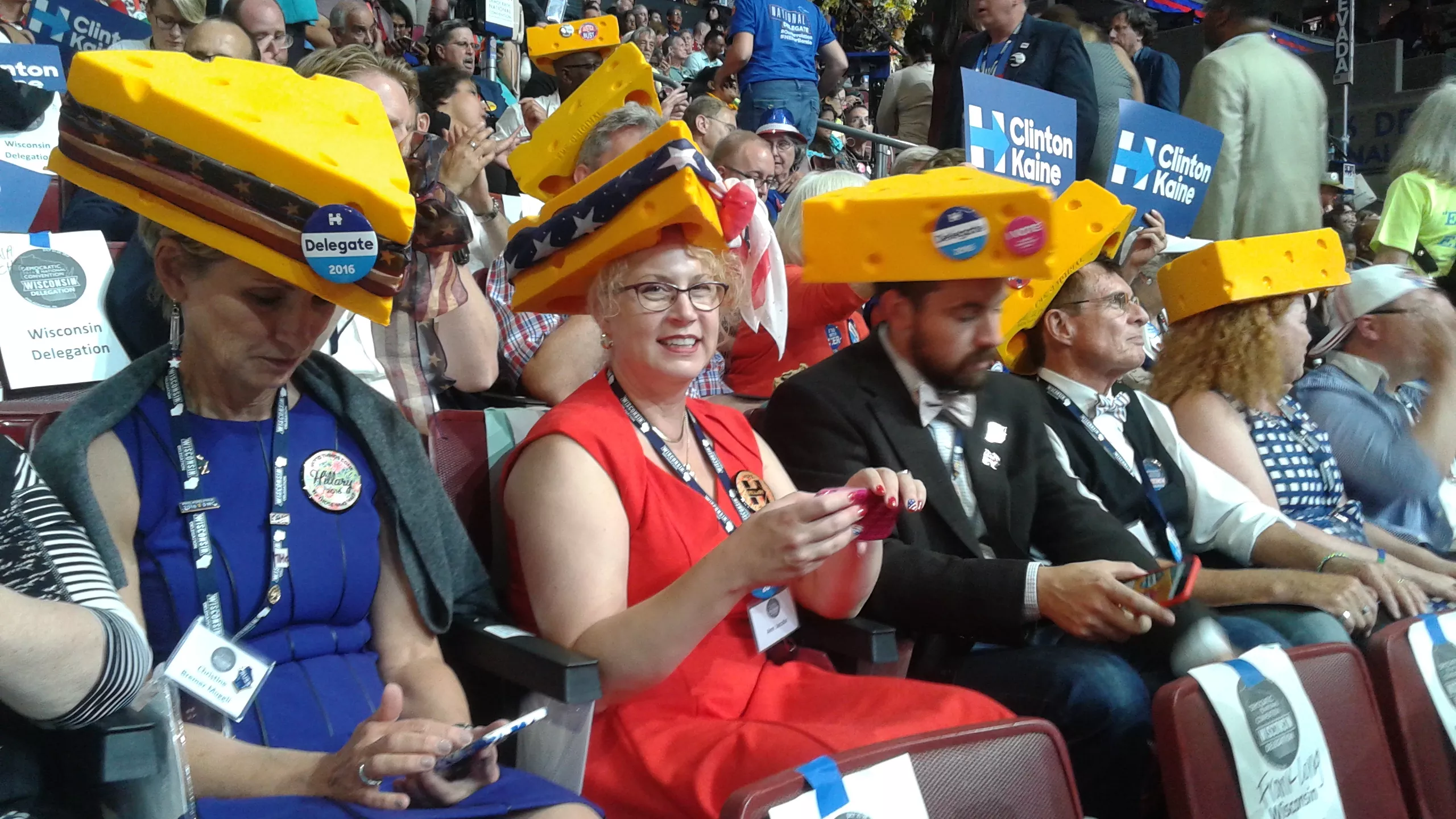 Of course there are the traditional Wisconsin cheesehead hats and some Texas delegates have gone for their trademark cowboy hat, but there’s also plenty of sparkle.