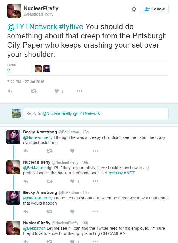 We were both confused because we had no male reporters there yesterday and even if we did, he wouldn’t be wearing a CP  t-shirt at a political convention. Sure we’re the paper that recently brought you the “Shit List,” but we do like to show a little more decorum than showing up at an event in our t-shirt. (Full disclosure, I am currently wearing a Pittsburgh Pirates shirt with a hole in the shoulder, but I don’t plan on being seen by Hillary Clinton today.) I assured the commenters that whoever it was, he was not affiliated with our organization. We give out free t-shirts all the time.