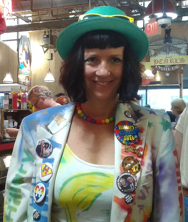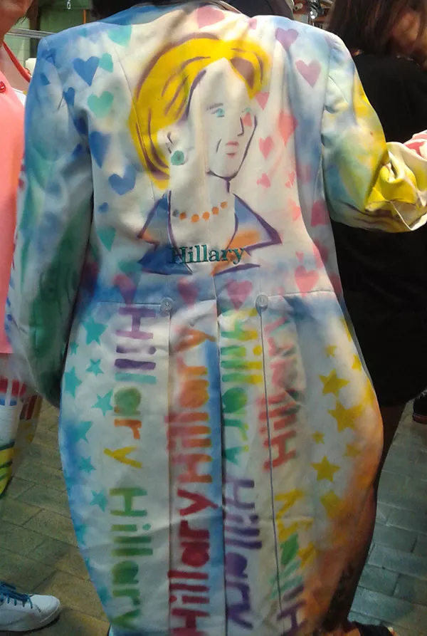 “This is a hand-painted Hillary jacket and suit. I’ve made a lot of them,” Baer says. “I’ve traveled around the country in my Hill car. a painted art car covered in Hillary imagery, all sorts of gems and jewels and buttons and so forth. I traveled around in 2008 as well this year all over the country.”