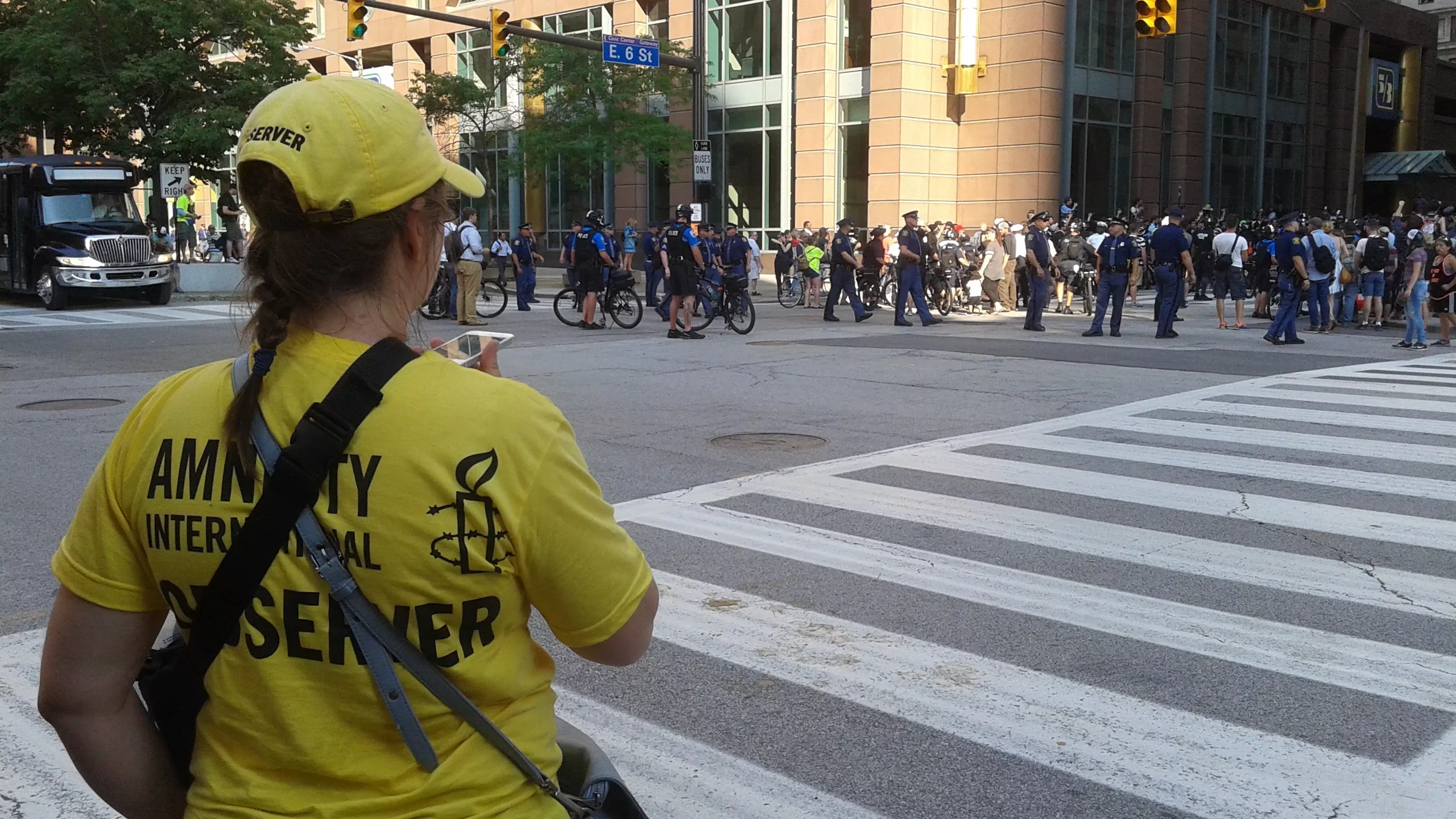 Throughout Cleveland this week for the Republican National Convention, several legal observing groups are watching to ensure that the law enforcement do not break First Amendment laws. Among them are the dozen Amnesty International team members in neon yellow shirts. City Paper ran alongside Amnesty International’s Eric Fererro and asked questions as he and other observers watched police surround a spontaneous and tense crowd at 9th and Superior.