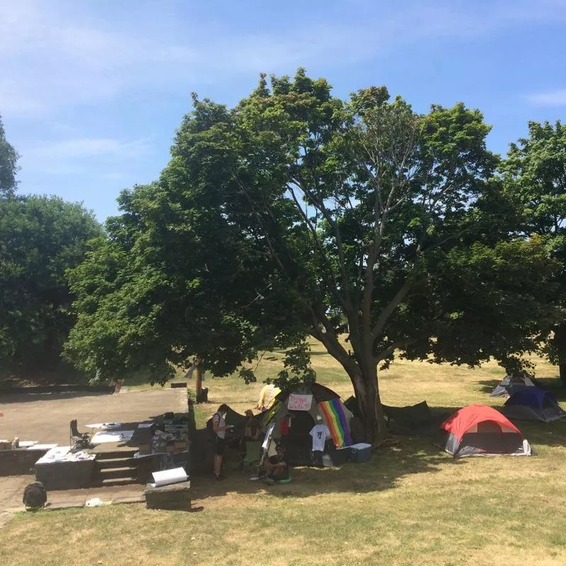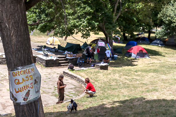 A Republican National Convention occupation is taking place at Goodrich-Kirtland Park, outside of Downtown Cleveland, Ohio. The space is located next to an airport, off of Interstate 90, opposite Lake Erie.