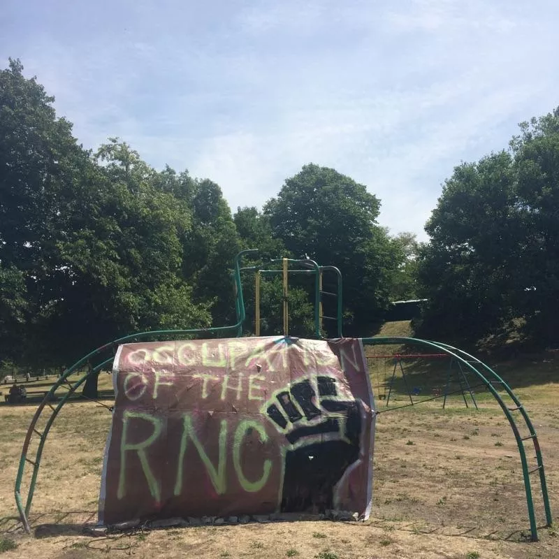 Around 40 occupiers have set up camp on the grounds, hailing from separate parts of the country. The trees and playground equipment in the park is adorned in proper fashion, most noticeable is a sign hanging from the park’s jungle gym, reading “Occupation of the RNC.”