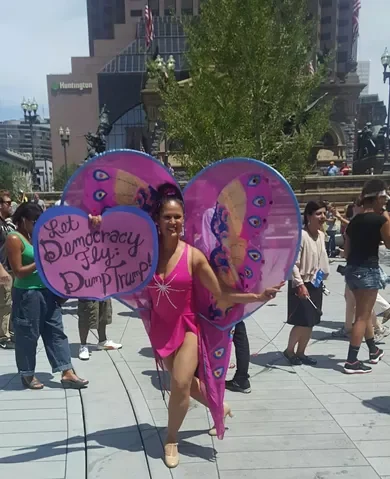 “It’s really funny. It’s political protests combined with a circus,” says Marnie Halasa, who dressed as a butterfly with a sign saying “Let Democracy Fly.” “The anti-Trump and pro-Trump protesters are all talking to each other here and mostly being civil. So the huge police presence is unsettling. I understand it, in light of [the shootings] in Dallas and Baton Rouge, but I think it’s overkill.”
