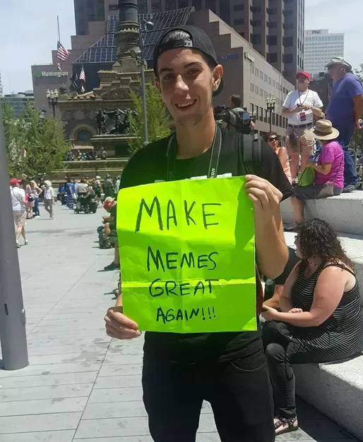 Today in the public square, his neon green sign reads “Make Memes Great Again.” Yesterday, his sign said “Shrek is Love. Shrek is Life.”