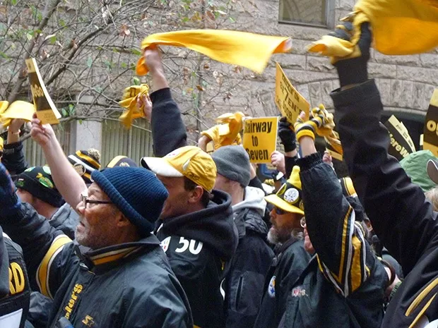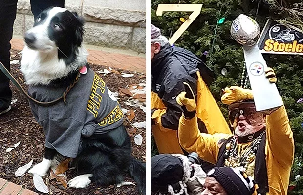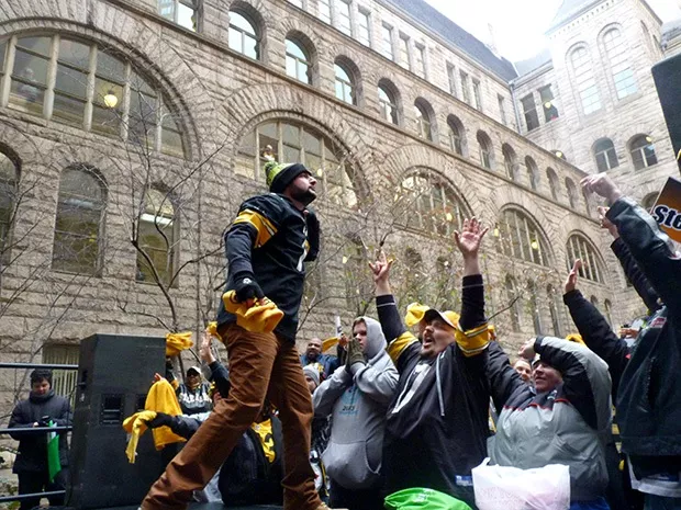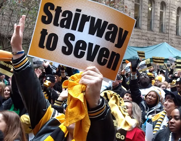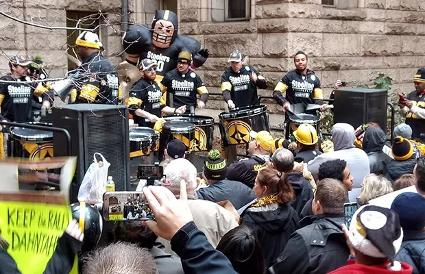 Steelers fans filled the courtyard of the County Courthouse in Downtown Pittsburgh earlier today, wearing black and gold and chanting the familiar anthem, “Here we go, Steelers, here we go!”