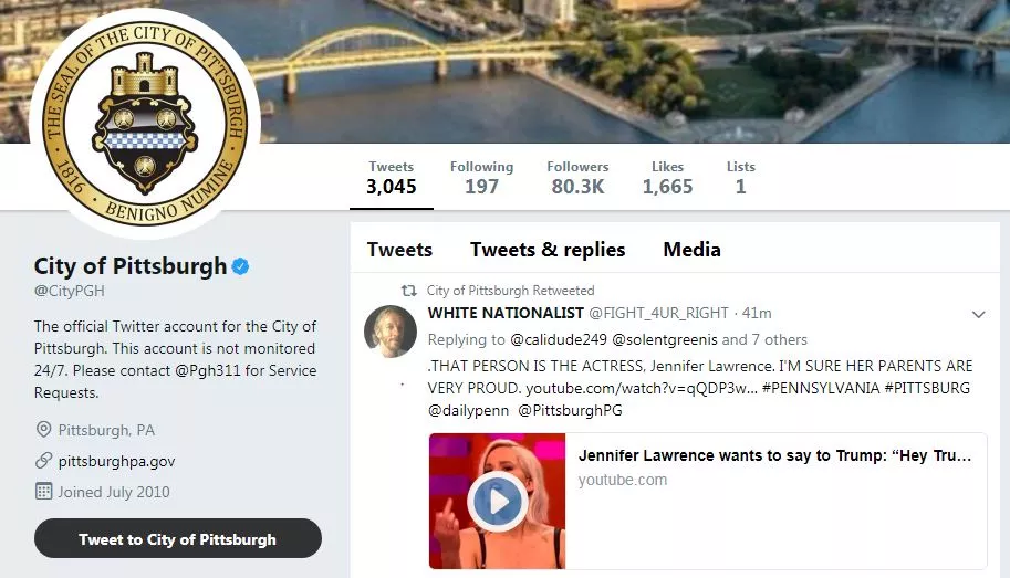 Sometime between 3 p.m. and 4 p.m., Pittsburgh’s official Twitter account, @CityPGH, retweeted a tweet from an account named “WHITE NATIONALIST” in all caps. The user’s handle is @FIGHT_4UR_RIGHT and the profile states, in all capital letters, “GLOBALISTS DESTROY BORDERS, LANGUAGE & CULTURE OF SOVEREIGN NATIONS. THEY WANNA DUMP TRUMP, HELP MUSLIMS & RULE THRU SHARIA LAW!”