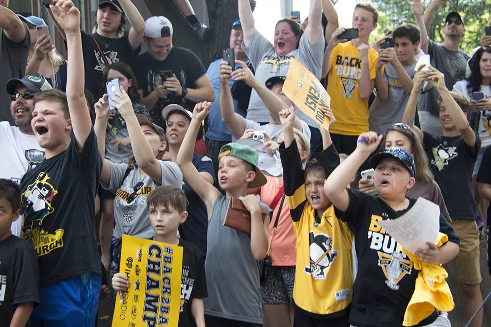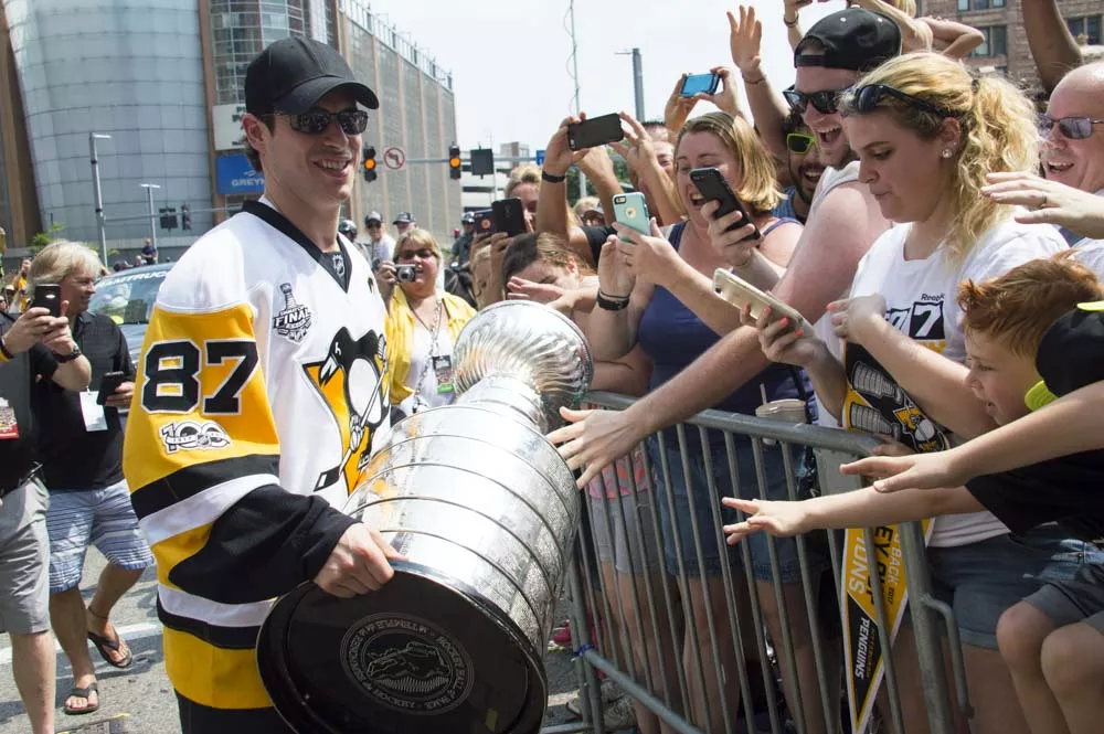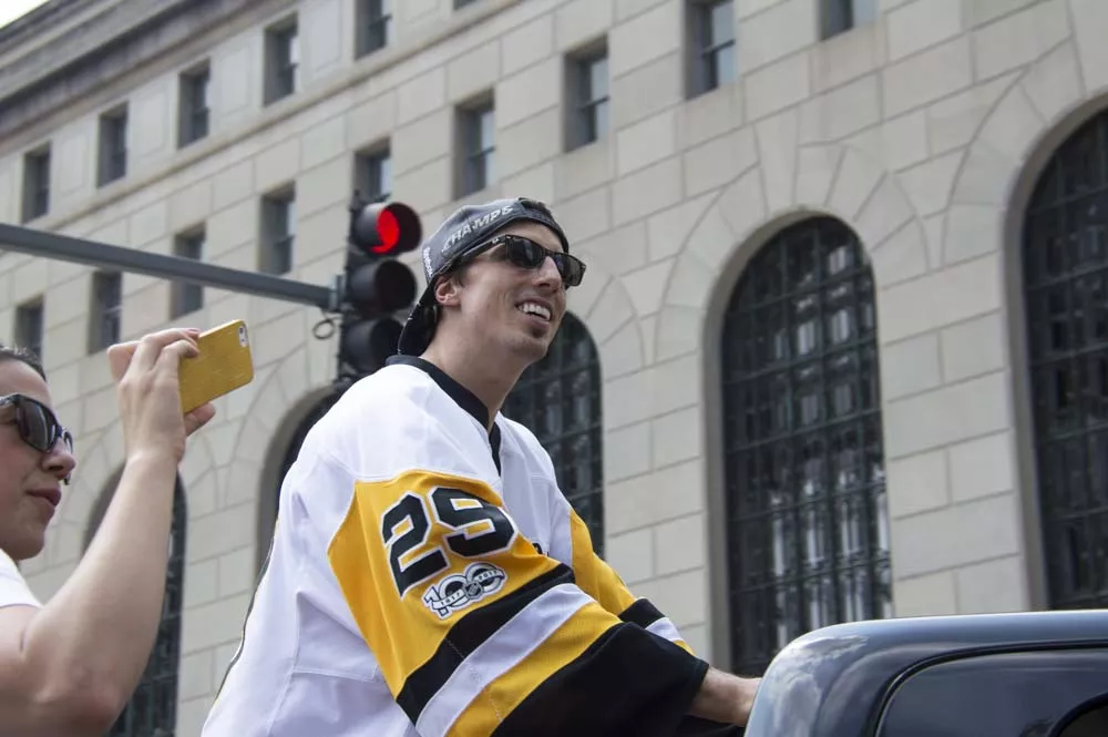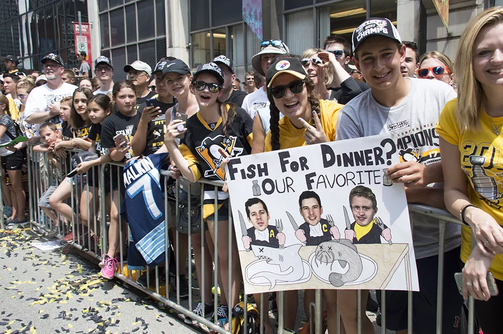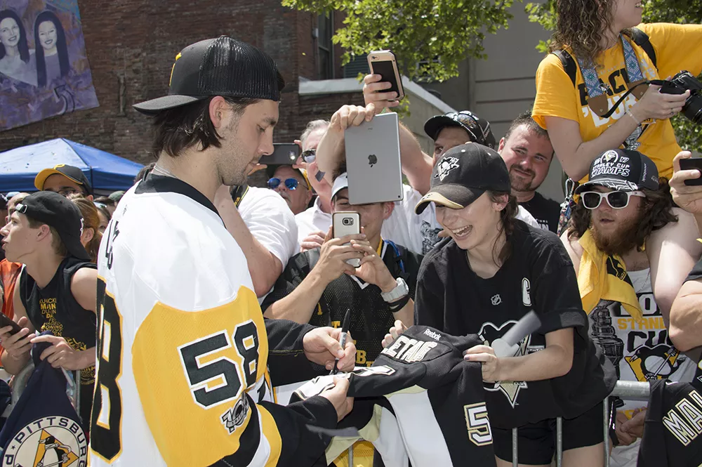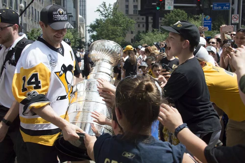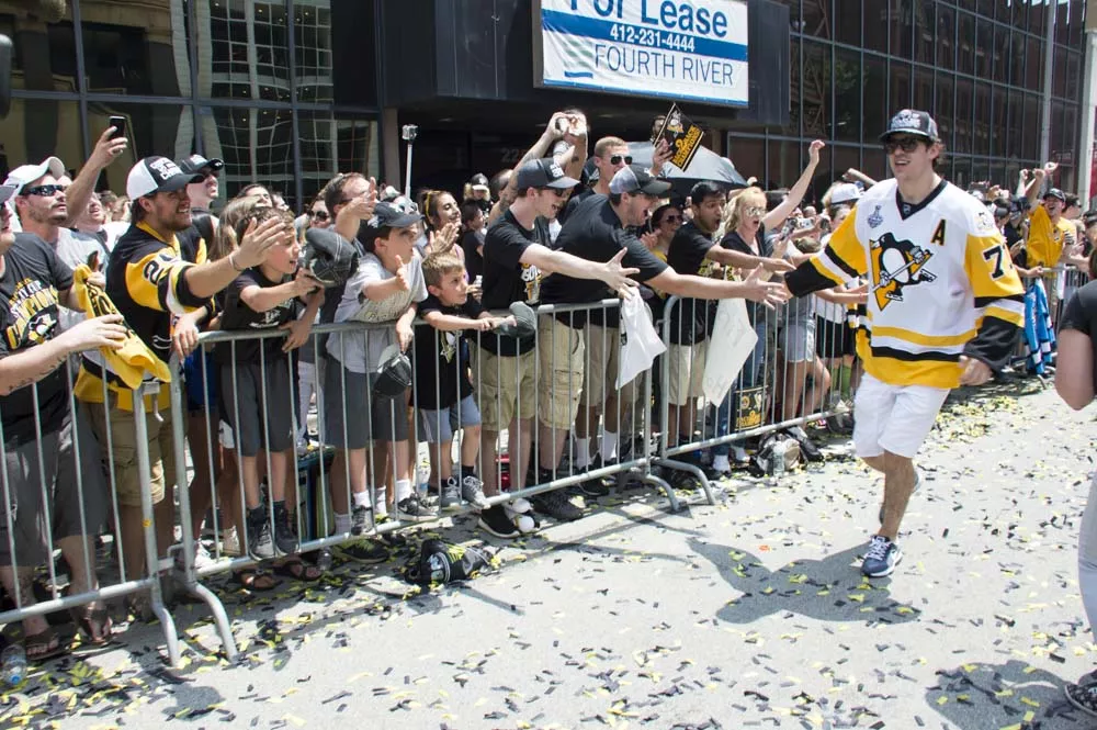 Pittsburgh City officials say more than 650,000 people came Downtown today for a victory parade honoring the Pittsburgh Penguins’ Stanley Cup Championship. While that number seems almost impossibly high — the city’s population is a bit more than 300,000 and there are just 1.2 million people in Allegheny County — there were tons of people in town today and they were ready to party. It got so crazy, apparently, that the Pens’ Phil Kessel even signed a screaming baby a la Ricky Bobby and Donald Trump.