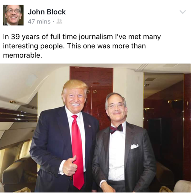 If staffers were worried then, they couldn’t have been happy to learn that John Robinson Block, the paper’s publisher and editor-in-chief, spent a little time in Toledo Wednesday hanging out on Donald Trump’s private plane and getting his picture taken with the Republican presidential nominee. The visit was even documented in the Toledo Blade, the P-G’s sister publication in Ohio.