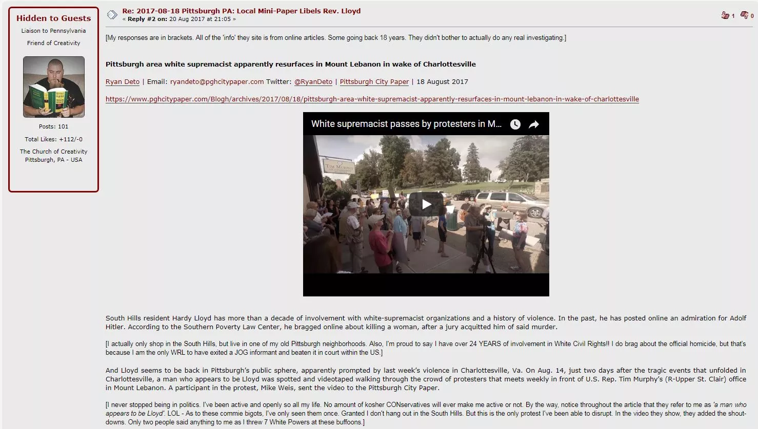 Lloyd took to the Internet to comment about the story and single out those who spoke to CP. For example, Lloyd called several sources connected to the story race traitors and in response to a source who said the situation in Mt. Lebanon with Lloyd “scares you.” To that Lloyd wrote: “If that scares you you’ll have a heart attack with my plans for the muds and jews [sic].”