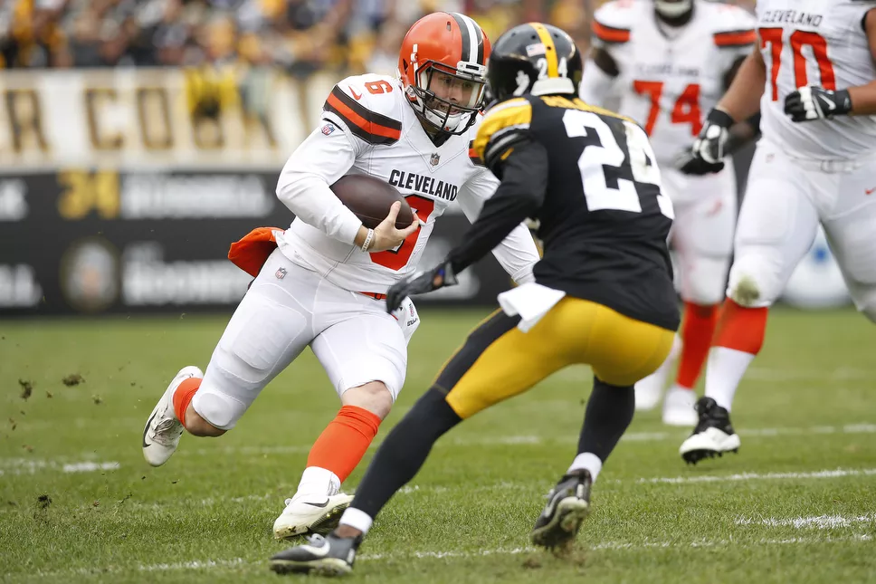 Baker Mayfield #6 of the Cleveland Browns runs with the ball past Coty Sensabaugh #24. Credit: CP Photo: Jared Wickerham