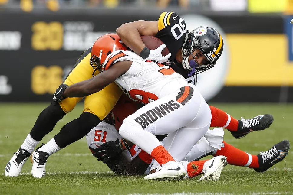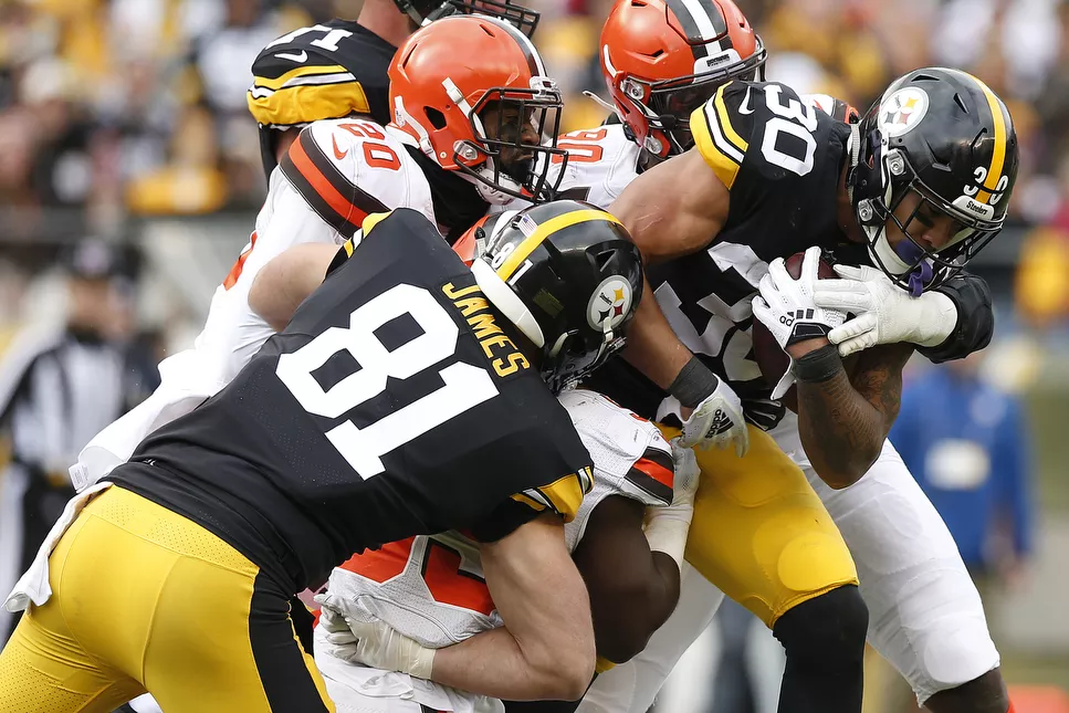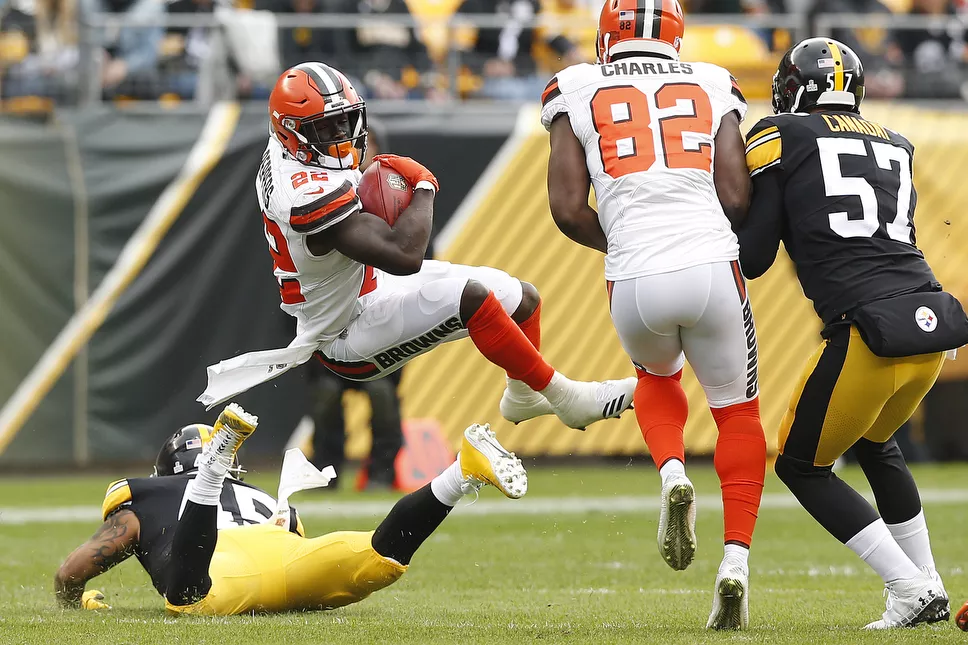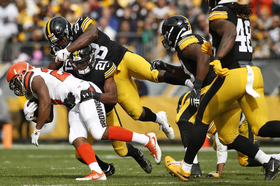 Duke Johnson #29 of the Cleveland Browns is gang tackled by Sean Davis #21 and Mike Hilton #28 of the Steelers. Credit: CP Photo: Jared Wickerham