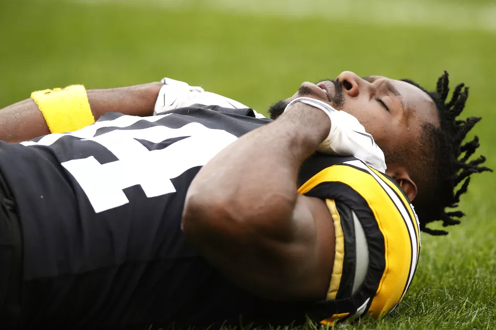 Antonio Brown lays on the field prior to kickoff. Credit: CP Photo: Jared Wickerham