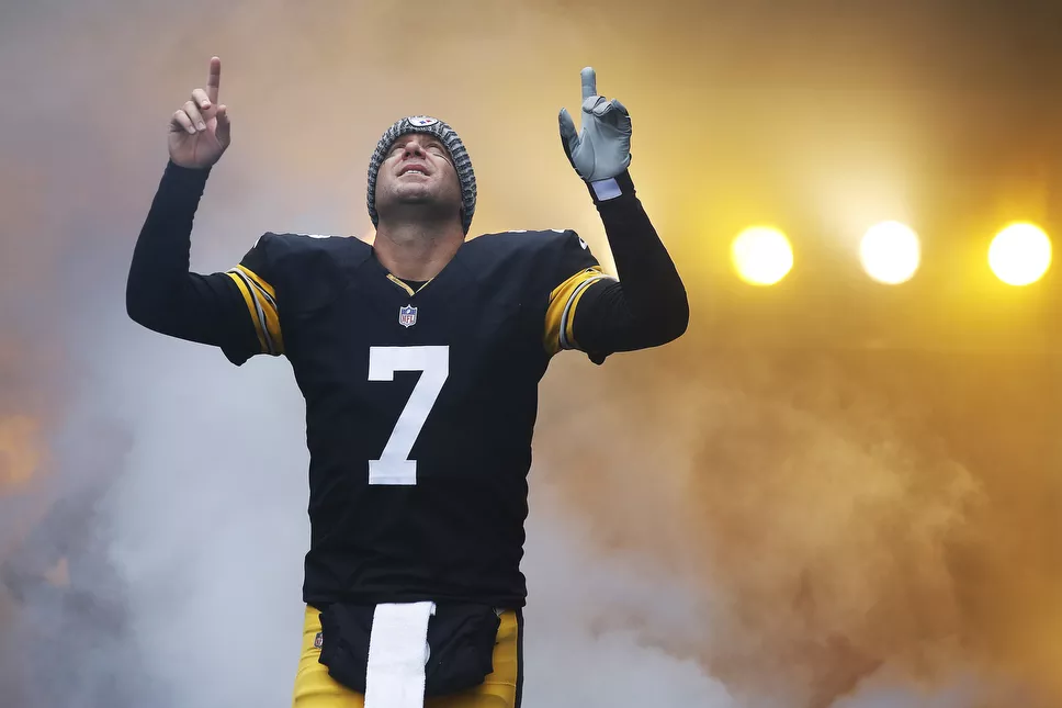 Ben Roethlisberger points to the sky as he exits the player tunnel. Credit: CP Photo: Jared Wickerham