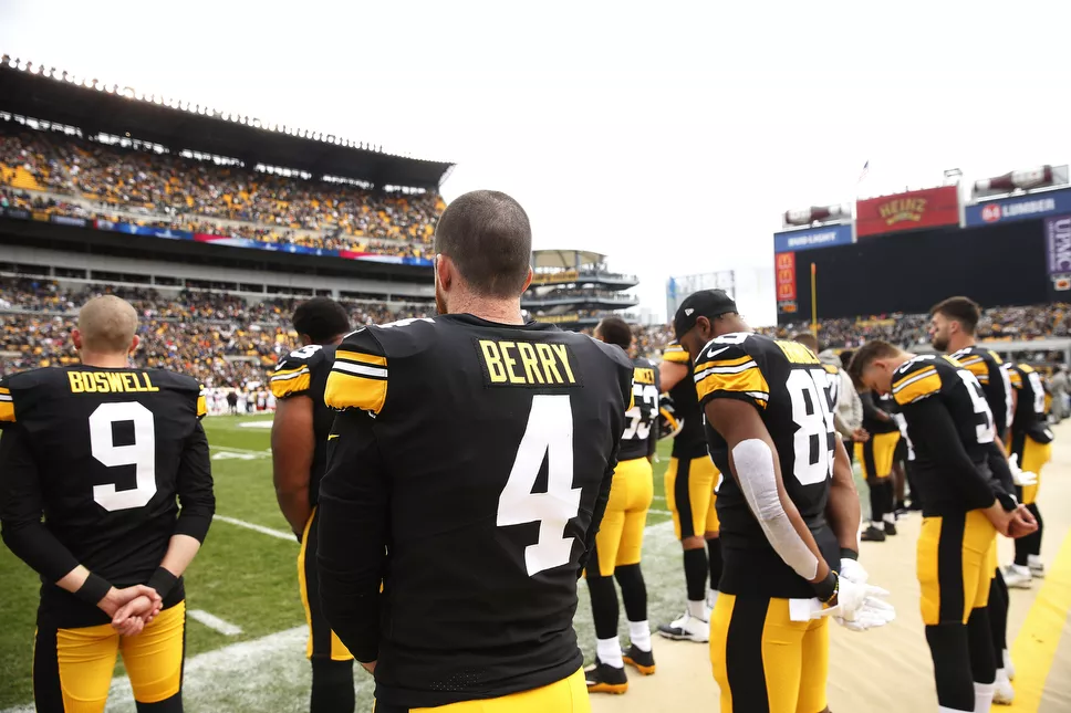 Jordan Berry and his teammates observe a moment of silence for the victims of the mass shooting at Tree of Life Synagogue. Credit: CP Photo: Jared Wickerham
