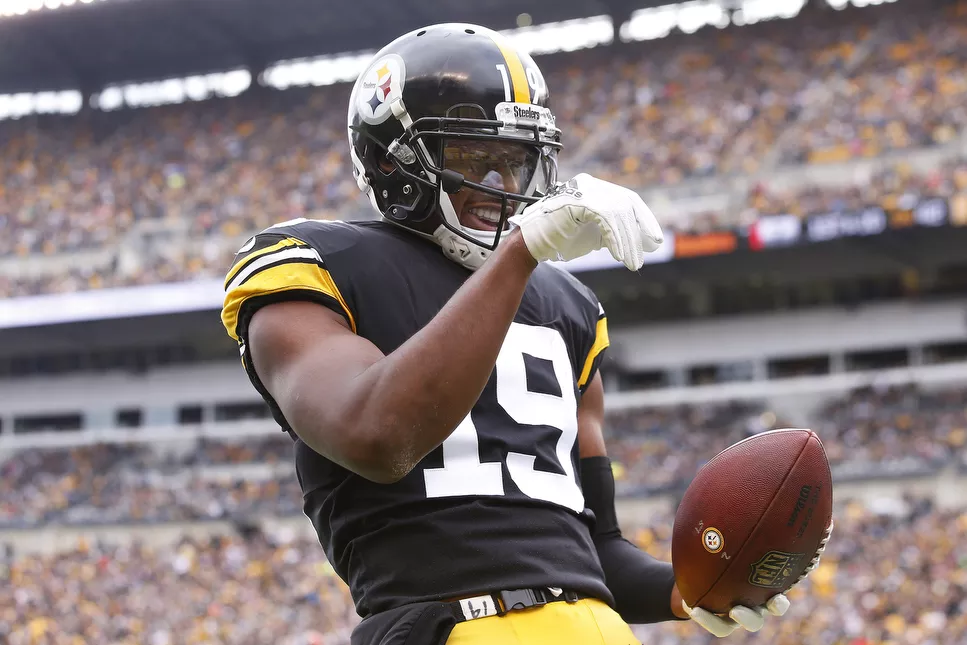 JuJu Smith-Schuster does his impression of the salt bae following a catch. Credit: CP Photo: Jared Wickerham
