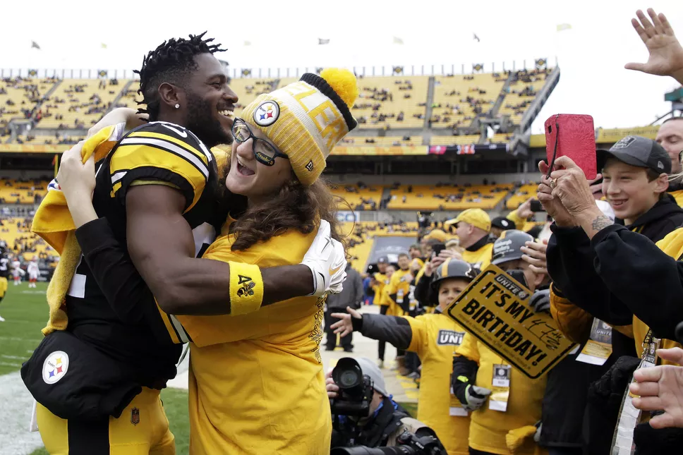 Antonio Brown hugs a fan on the sidelines prior to kickoff against the Cleveland Browns at Heinz Field. Credit: CP Photo: Jared Wickerham