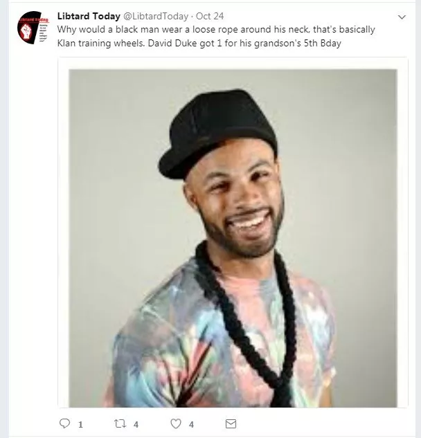 On the LibtardToday Twitter account, Hudak referenced the Ku Klux Klan and white supremacists in a post with a picture of Bracey, inclusing the caption: “Why would a black man wear a loose rope around his neck, that’s basically Klan training wheels. David Duke got 1 for his grandson’s 5th Bday.”