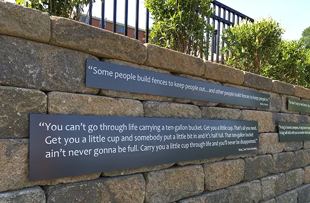 Quotes from August Wilson plays adorn a wall in his namesake park. Credit: Photo courtesy of Scott Roller/Pittsburgh Parks Conservancy
