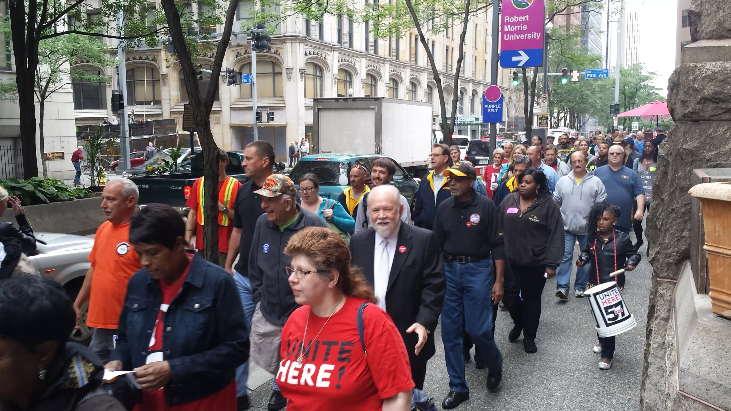 Workers and supporters march in front of the Allegheny County Courthouse. Credit: Photo by Rebecca Nuttall