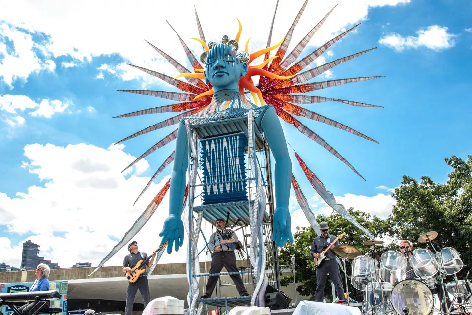 Pneumatica should be well-matched. The air-themed, air-powered outdoor show, which premiered at the Three Rivers Arts Festival, is a burst of Squonk’s potent music (including drums, bass, guitar, O’Hearn’s keyboards and O’Hearn’s electronic bagpipes) and inflatable sculptures including (in Squonk’s words), the “40-foot high Lady Pneumatica, who incorporates a wind turbine on her head. She blossoms with sails, breathing steam and raising her inflated arms to the sky.” And her lungs are a playable accordion.