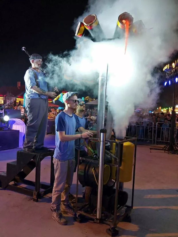 One of our smoke machines, a crucial part of the artistry that is Squonk – or at least a show called Pneumatica – broke down right before the show. Although we had a pretty good record for 55 shows here, considering all of the technology arrayed in the middle of this festival of ten million visitors, emotions flared. Some Squonkers were accused of indolence, and a lack of character, without regard to the actual cause of failure. Steve later recanted most of these the cruel invectives, explaining that his blood sugar had been low.