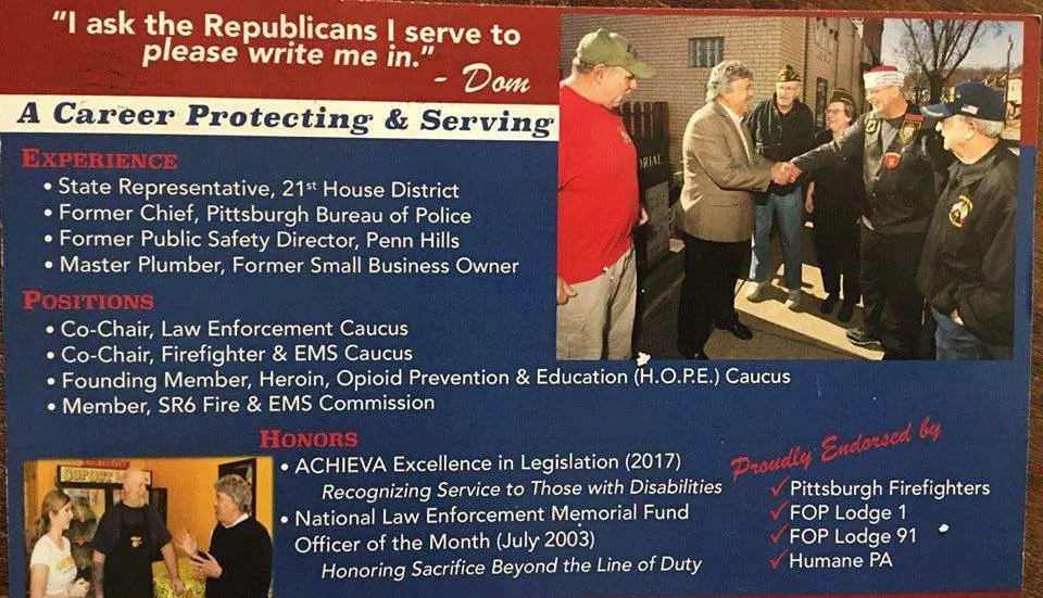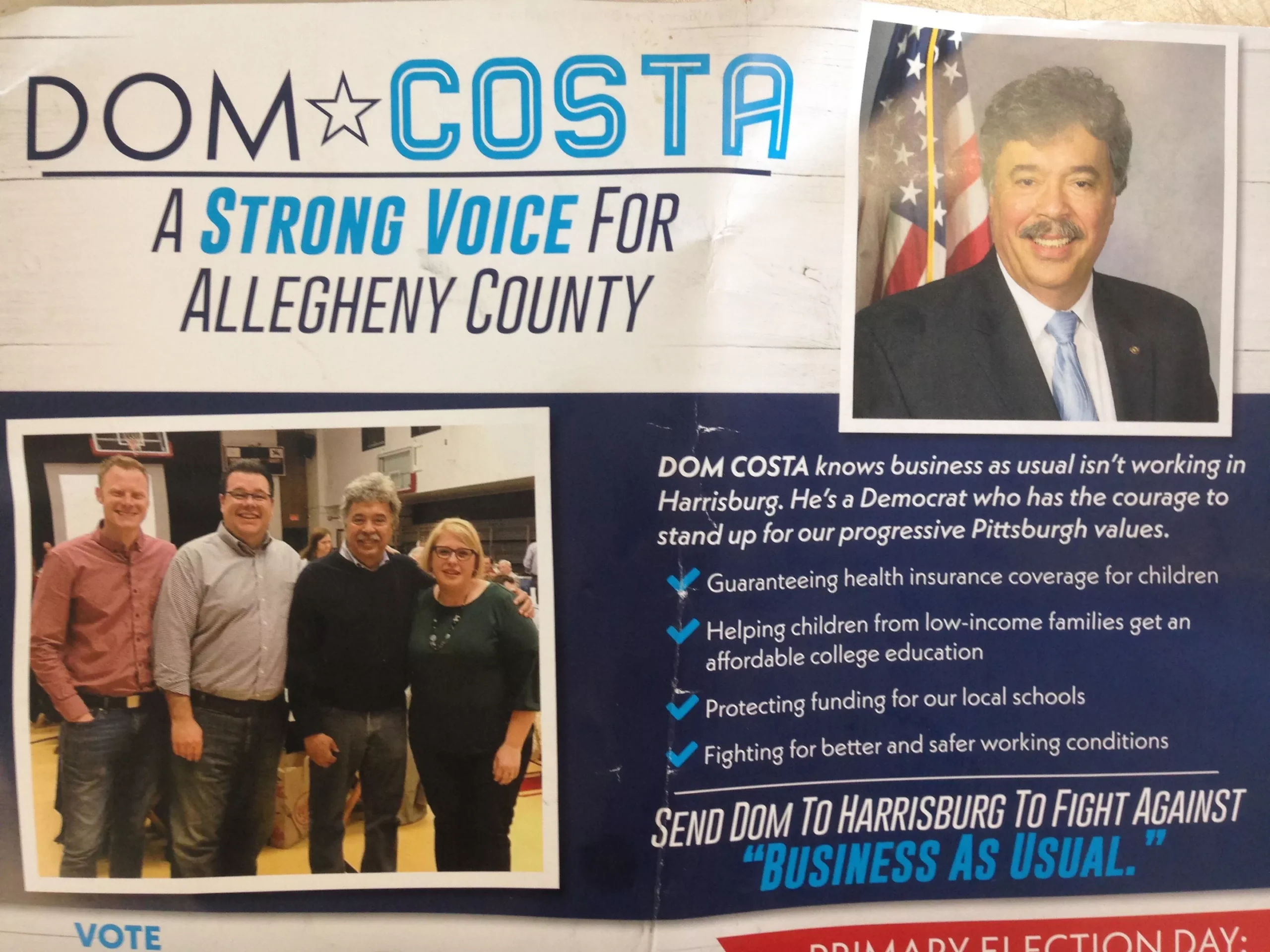 Sometime last week, state Rep. Dom Costa (D-Stanton Heights) sent out a mailer to some Democratic voters asking for their support. In the mailer, Costa is described as “a Democrat who has the courage to stand up for our progressive Pittsburgh values.” The mailer then details Costa’s support for guaranteed health insurance for children, protecting funding for public schools and fighting for safer working conditions. (It fails to mention, however, Costa’s not-so-progressive support of anti-immigrant bills, pro-gun legislation and pro-life stances.)