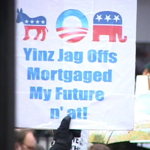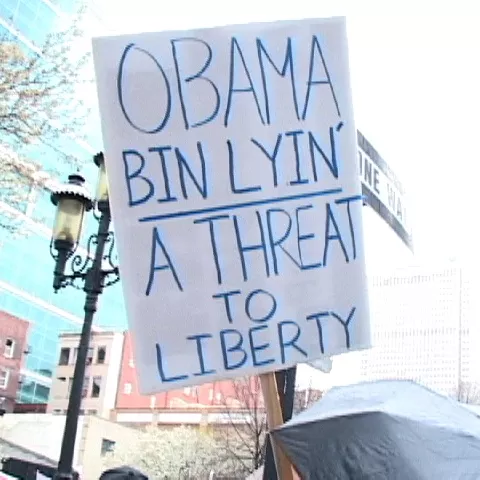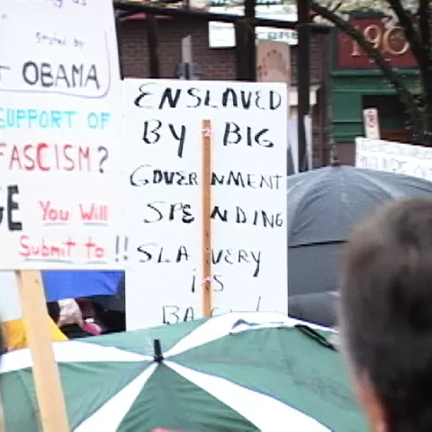 The picture quality here isn’t great, I’ll admit. But the sign says “Enslaved by big government spending. Slavery is back!” If you think black people had it bad in the 19th century, I hope this puts things in perspective.