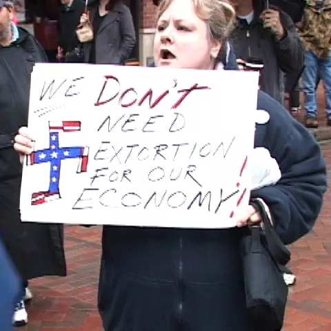 (The counter-demonstrators were also told to “learn how to talk” and “get a job” by a couple members of the nearly-all-white Teabaggin’ crowd. The latter charge is especially mystifying: We were ALL here on a weekday, during the lunch hour. Why would anyone assume the counterdemonstrators were the only ones who needed a job? Unless, of course … )