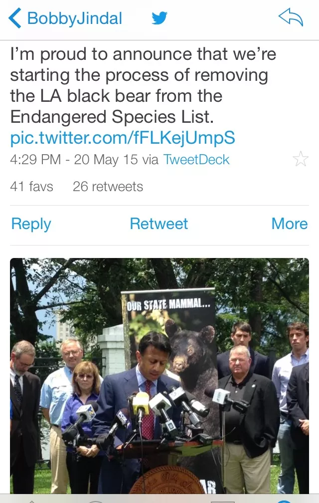As of today, Jindal’s Twitter page header features a photo of the governor posing shamelessly with the Duck Dynasty dudes, but for us, the winner is this earlier snap from May in which the gov is being photobombed by a bear, a.k.a. the “state mammal.”