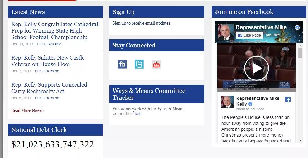 Twenty-one trillion dollars and counting. That is what the national-debt clock reads on the homepage of U.S. Rep. Mike Kelly (R-Butler). A similar clock also appears on the pages of U.S. Rep. Keith Rothfus (R-Sewickley) and U.S. Rep. Tom Marino (R-Williamsport).