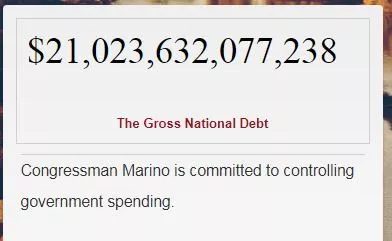“The federal government must work to both eliminate every cent of waste and squeeze every cent of value out of each dollar our citizens entrust to it,” is written directly below the debt clock on Marino’s website.