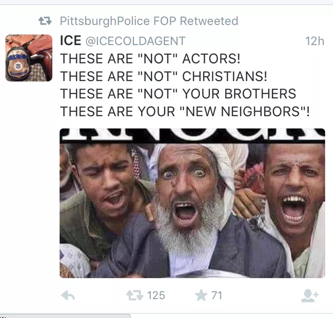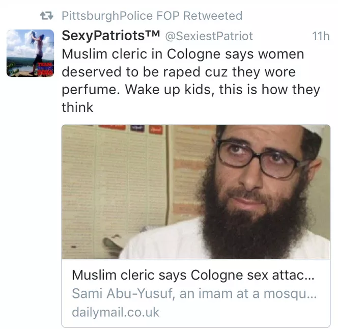 Earlier today a Twitter account titled Pittsburgh Police FOP with the handle @foplodge1pgh retweeted two Islamaphobic tweets on their page.