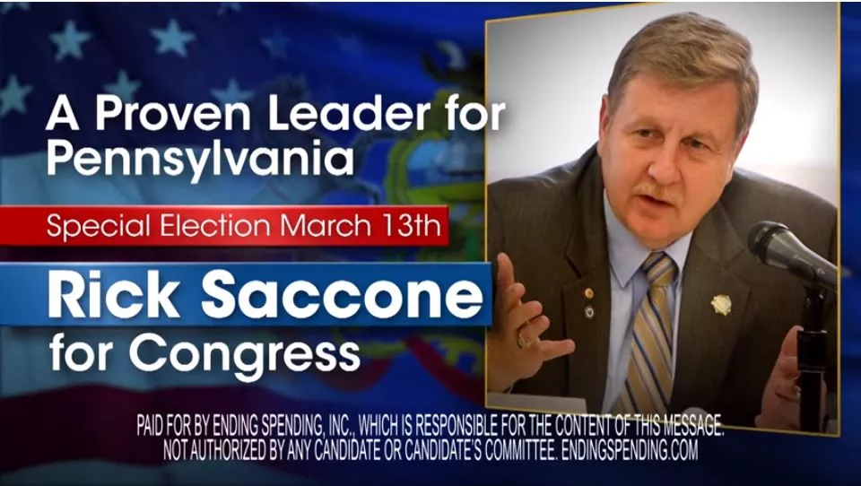 A screen shot of the Ending Spending Inc. TV ad supporting Rick Saccone Credit: Image courtesy of YouTube