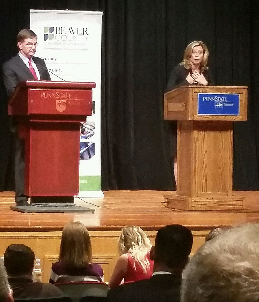 Erin McClelland and Keith Rothfus during a debate at Penn State Beaver Oct. 6. Credit: Photo by Charlie Deitch