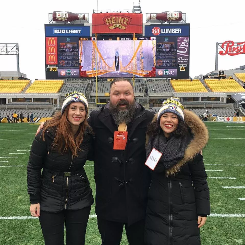 While the Steelers’ brutal loss to the Patriots Sunday night is a memory most Pittsburghers would like to leave behind, Clinton Clegg had a night to remember. The iconic local vocalist and frontman for rock/soul outfit The Commonheart opened the game with a powerful rendition of the national anthem, joined by his bandmates Mariko Reid and Anne Celedonia.