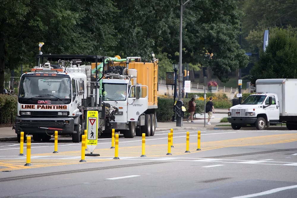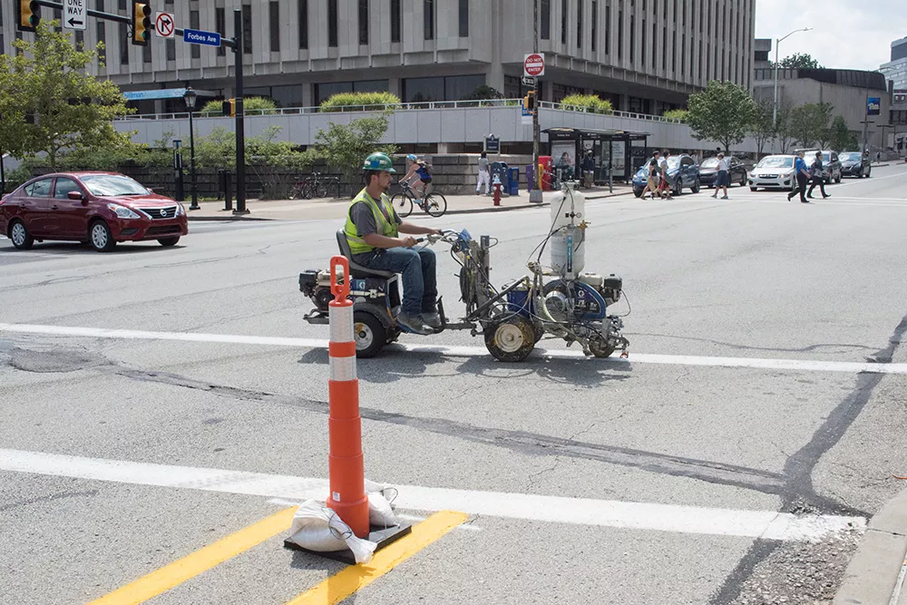 One of those new applications is unique to the city, but necessary since Oakland has many one-way streets for cars. Saunders says the counter-flow bike lane, which will run on the left side of Forbes Avenue from Bigelow to Bellefield, will be important to give cyclists safe passage through Oakland. But it will also help take cyclists off the sidewalk, where they are not legally allowed to ride, but often do because bike lanes were not present. The counter-flow lane will be marked by a double yellow line, and will transform that section of Forbes into a two-way street, but only for bikes.