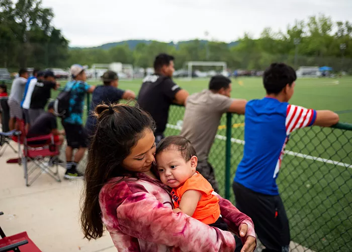 Darlin Recinis holds a friend’s child, Kenjy Santizo, 8 months, while watching a soccer game at Montour Junction Sports Complex in Coraopolis on July 31. Credit: CP Photo: Nate Smallwood