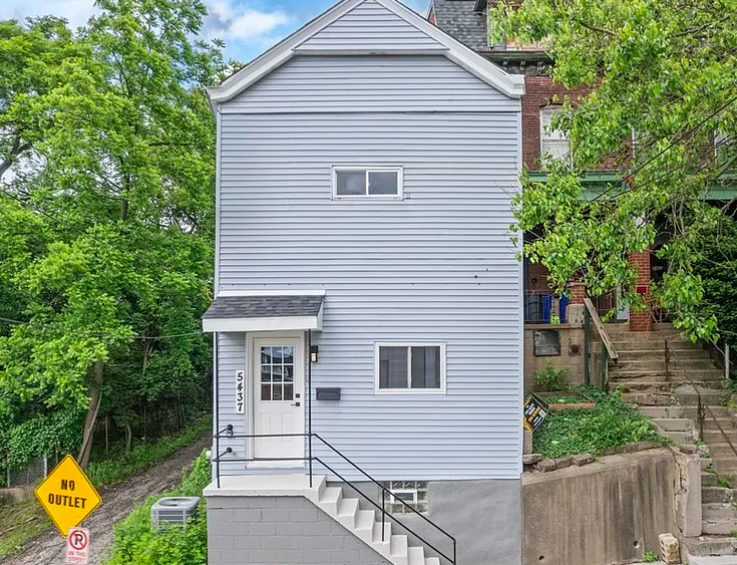 Now this is commitment to the weird-little Pittsburgh-house bit. This cyclopean abode looks down from its cement perch with disdain; clearly, there’s nothing worth seeing down below, or we would have put in windows. Inside, the bright-white walls and laminate floors seem scraped clean of character, but the exterior has more than enough of that. Next door is a truly stellar example of a crumbling, scary city staircase, and off to the other side is an equally ominous “No Outlet” sign.