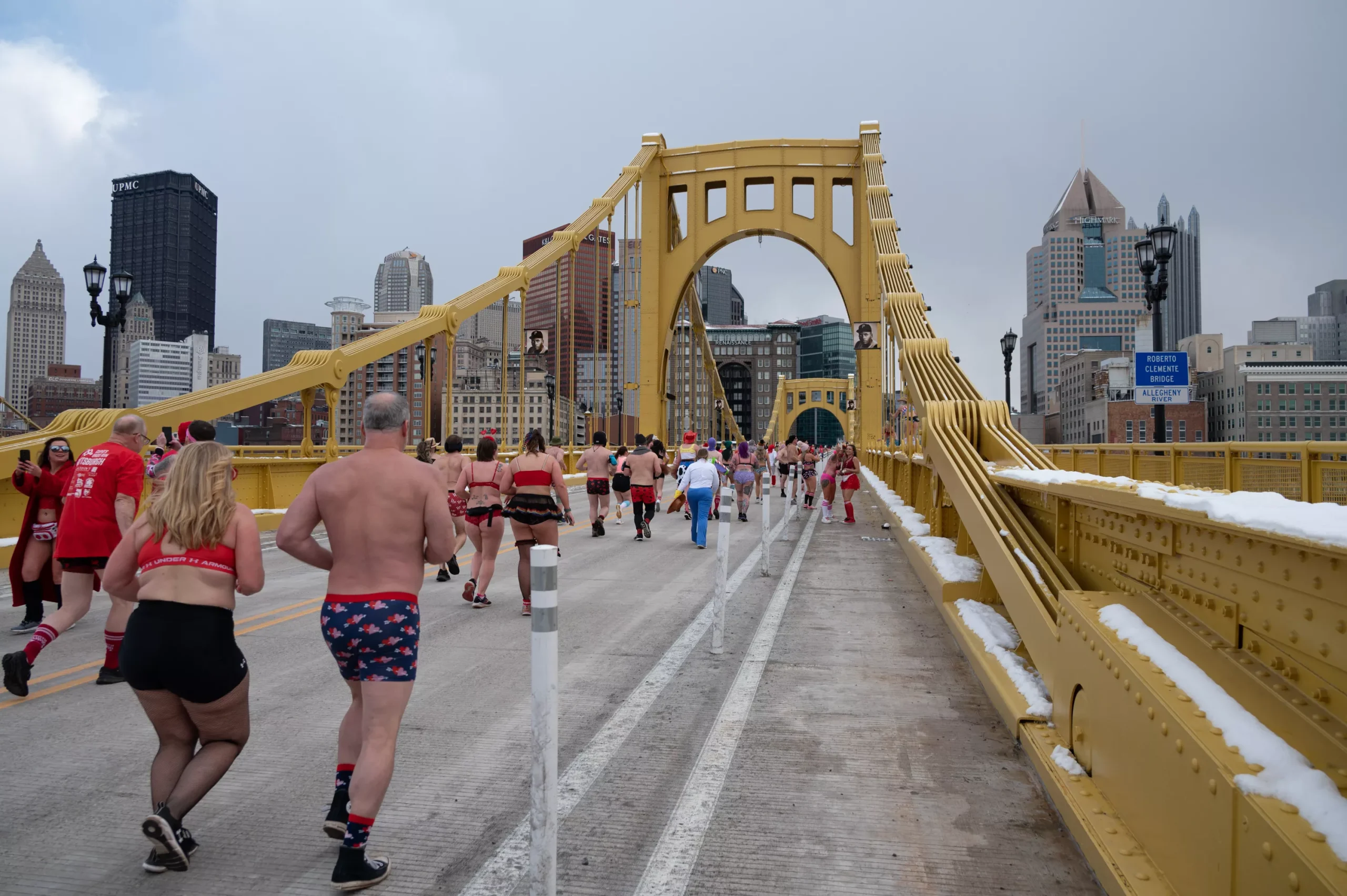 Despite everyone’s mock grumblings about the cold, the energy is gleefully squeamish. Out of the loose congregations and solo runners dotting the Roberto Clemente Bridge, you can pick out the likes of Zeus, Superman, a Ghostbuster, a fairy, Buzz Lightyear, Spongebob, a ballerina, and hundreds in pink or red underwear.