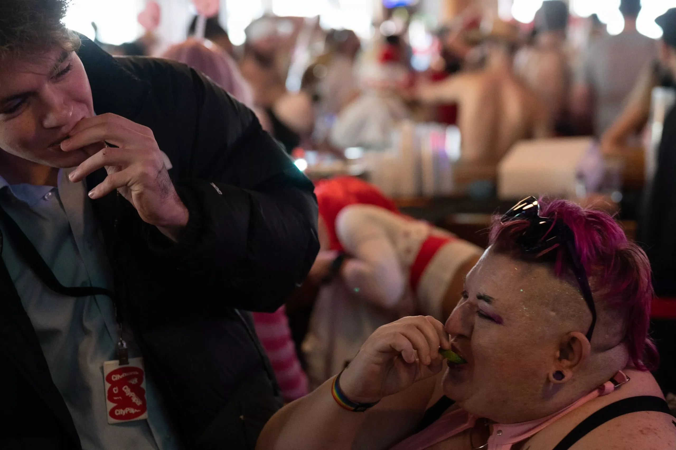 Out on the blocked-off streets, I meet a recently divorced, first-time undie-runner named Bert, who tells me he is out here looking to try new things and get out of his comfort zone. I joke with a bartender named Nick, who is heaved over himself, that he should lay off the cigarettes. “Fuck you,” he says, kidding. “I mean, you’re right, but fuck you.”
