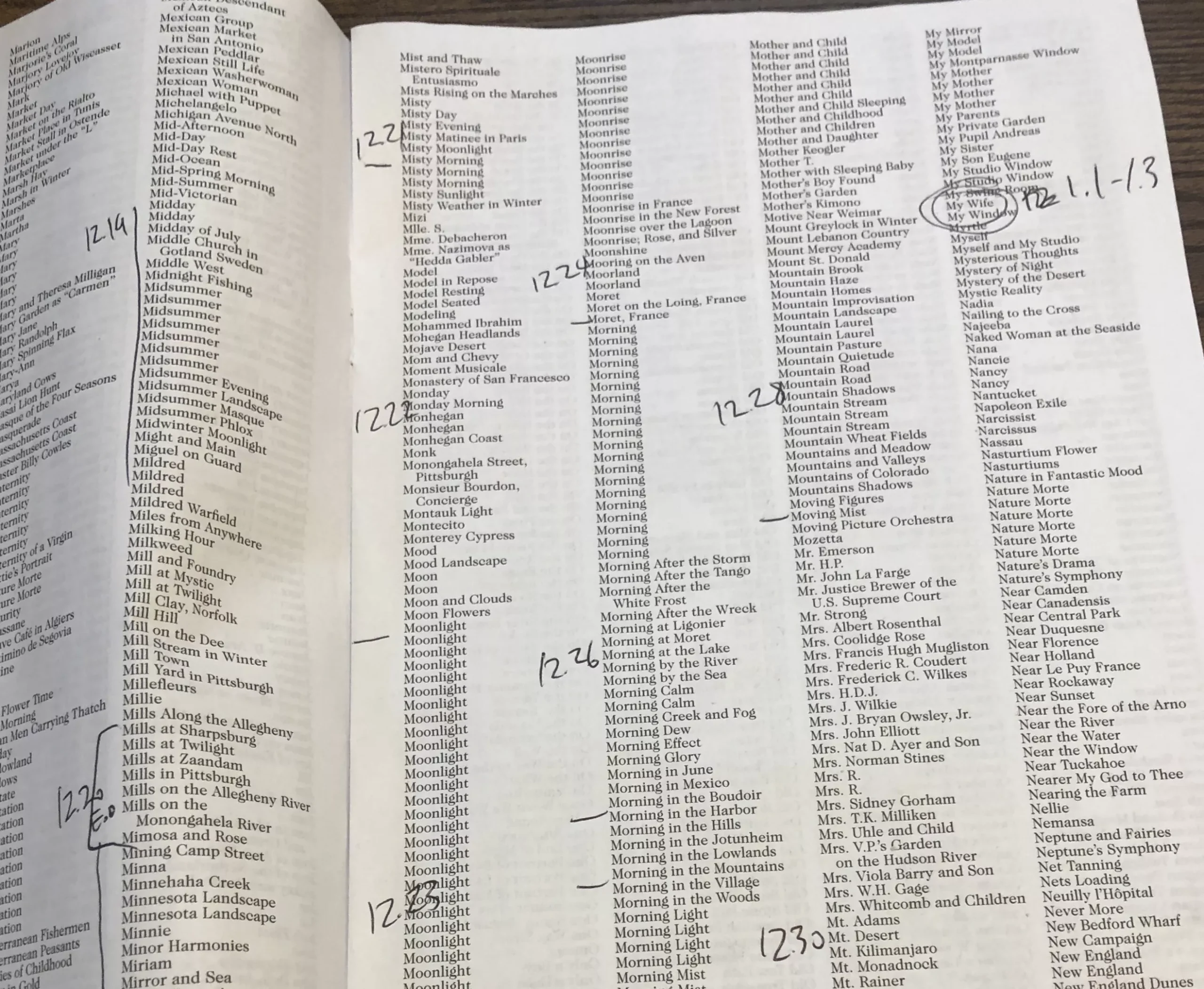 On a Saturday in November, my girlfriend and I activated our joint membership to the museums and made the trip to Carnegie Museum of Art. When we arrived, they were busting out many copies of “Evening,” a fine word to hang on your wall. I searched the catalogue of 10,632 rejected titles of and among the morass of “Flower”s and “Portrait”s — easily two of the most common titles to be rejected — was “My Wife.” It had to be mine.