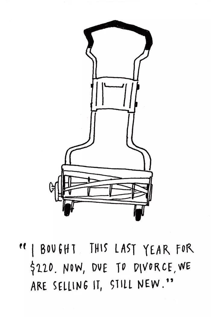 Stuff can be complicated, especially when trying to get rid of it. The process can remind us that our things can have worth that’s hard to put a dollar amount on; they can call to mind other people from our lives; they can bring up memories of what they were (or weren’t) used for. For Sale with Baggage documents items for sale in the Pittsburgh area from marketplace listing sites. Captions are written by the owners themselves, illustrated by Abbie Adams.