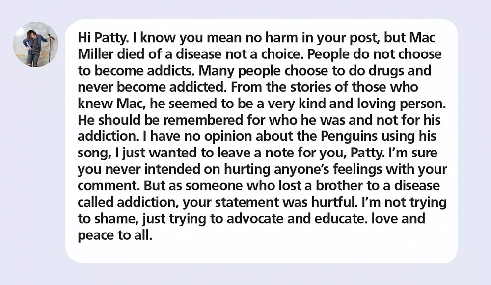 Recently, KDKA’s Rick Dayton posted on Facebook a link to a story about the Penguins not changing their goal song to Mac Miller’s “Party on Fifth Avenue.” I’m not really a sports aficionado, but I am a fan of Mac, and I was taking his death particularly hard. It triggered grief for my brother, who died the same way that Mac had been reported to.