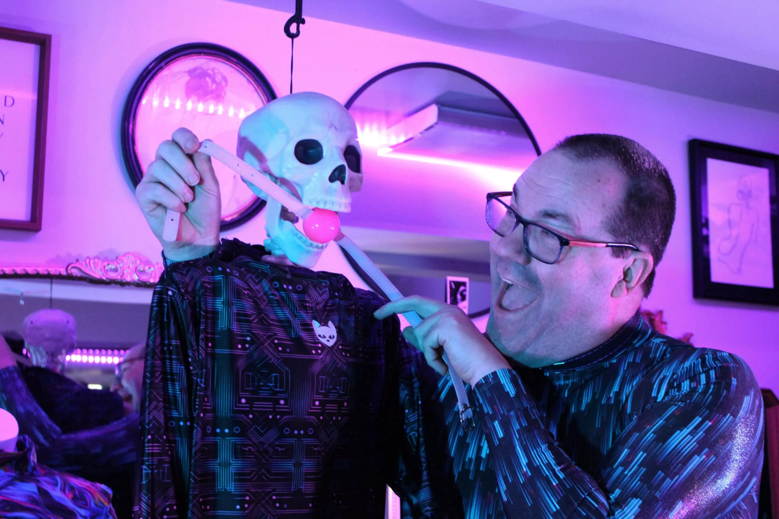 As an adult in the ‘80s, he started experimenting with leotards and tights (they weren’t hard to come by then!) and found that he was turned on by the feeling. Over Zoom he tells me, “My private region was caught in a bondage, so to speak, and it turned me on.” In college, and later in his ‘20s, his internal struggle with his desires caused him to binge and purge bondage paraphernalia. He says, “I’d buy clothes, then I’d throw them all away; I’d buy magazines, then I’d throw them all away.”