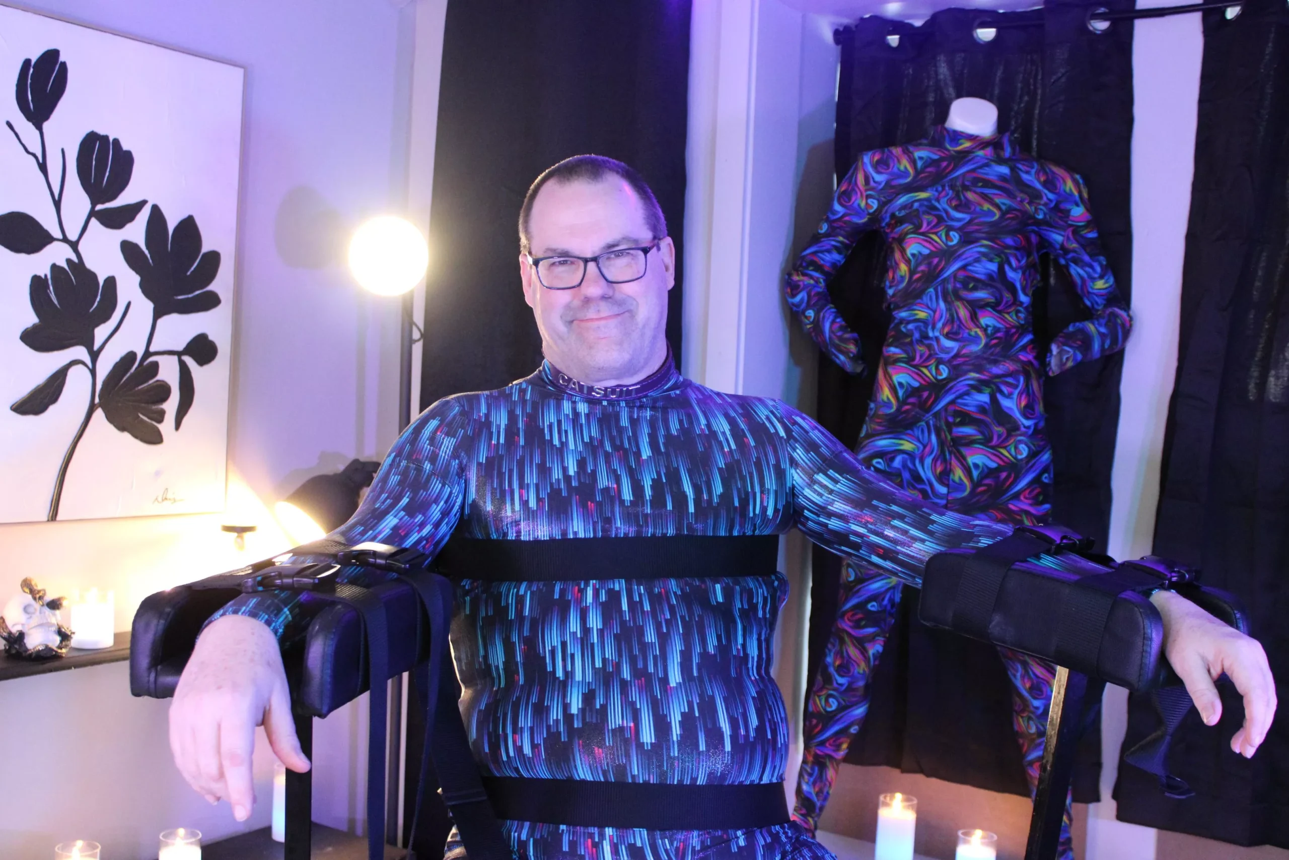 When you wear a catsuit, like right now, I am feeling the catsuit hold and caress my right shoulder. But if I let my mind wander, I realize it’s on the bottom of my foot, and now it’s on my left hip and on my chest, and suddenly I am surrounded in touch. My catsuits quit being sexual; they started being an anxiety armor. And in scenes [where he and his play partner(s) act out a pre-negotiated kink dynamic], they become sensation amplifiers.