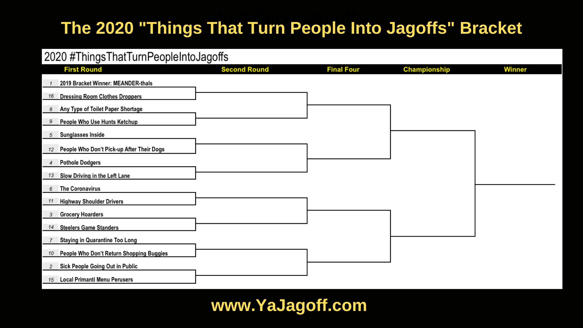 The Things That Turn People Into Jagoffs begins with a Sweet 16, otherwise “it would take forever,” says John. Though the 16 jagisms have already been selected — one submission coming from as far as Anchorage, Alaska — you still have a chance to vote your favorites into the Elite 8, Final Four, and championship rounds.