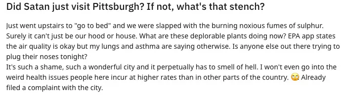 “Did Satan just visit Pittsburgh? If not, what’s that stench?” reads the post, which CP removed identifying information from. “Just went upstairs to ‘go to bed’ and we were slapped with the burning noxious fumes of sulphur [sic]. Surely it can’t just be our hood or house. What are these deplorable plants doing now? EPA app states the air quality is okay but my lungs and asthma are saying otherwise. Is anyone else out there trying to plug their noses tonight? It’s such a shame, such a wonderful city and it perpetually has to smell of hell …”