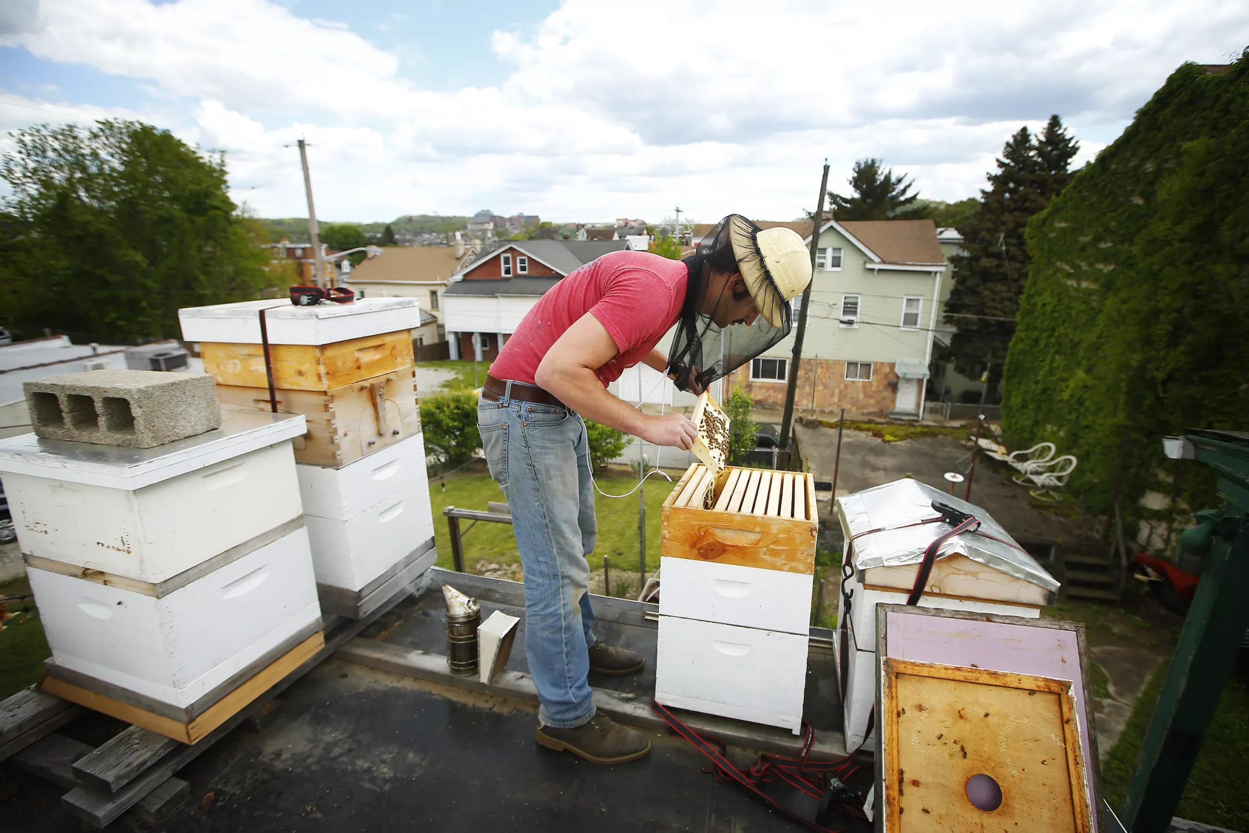 Ben Muti tends to his beehives atop his Troy Hill home. Credit: CP Photo: Jared Wickerham