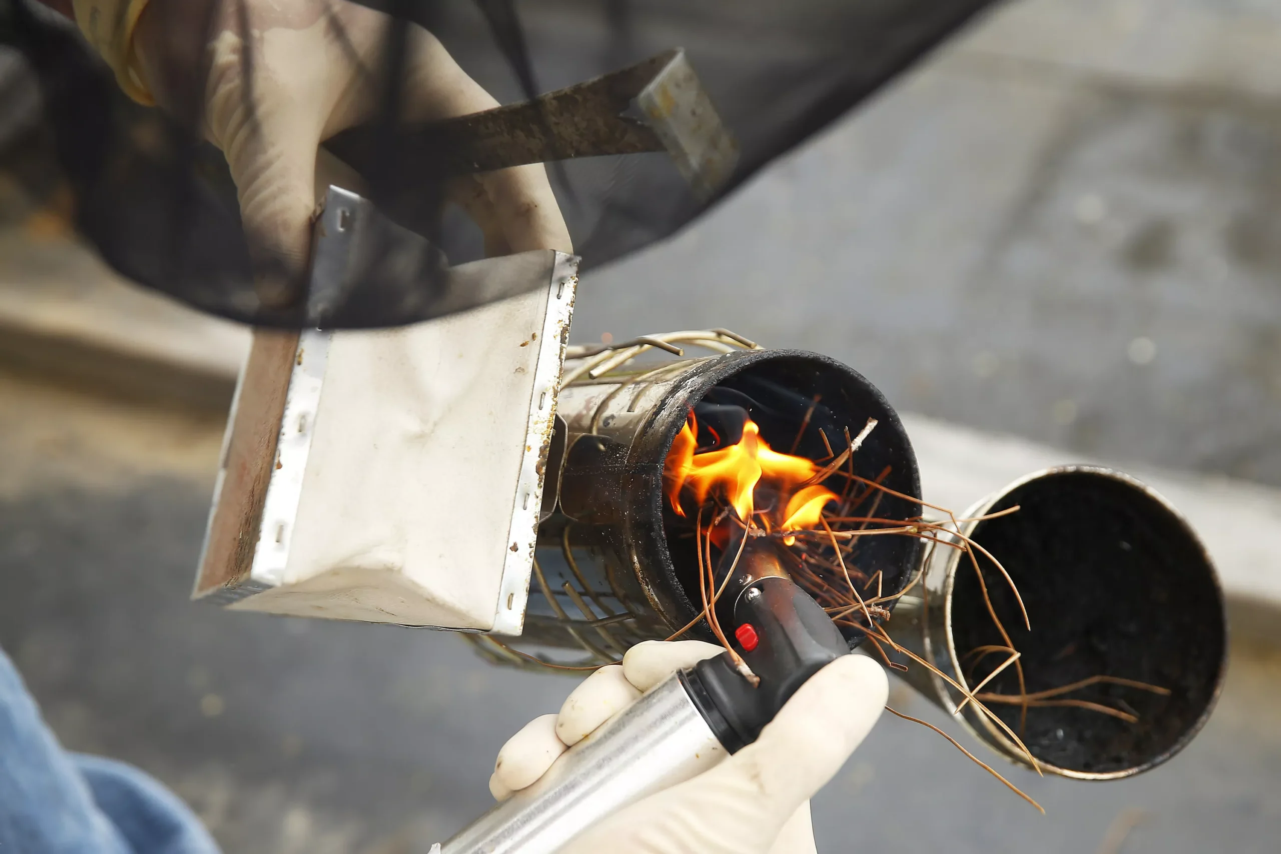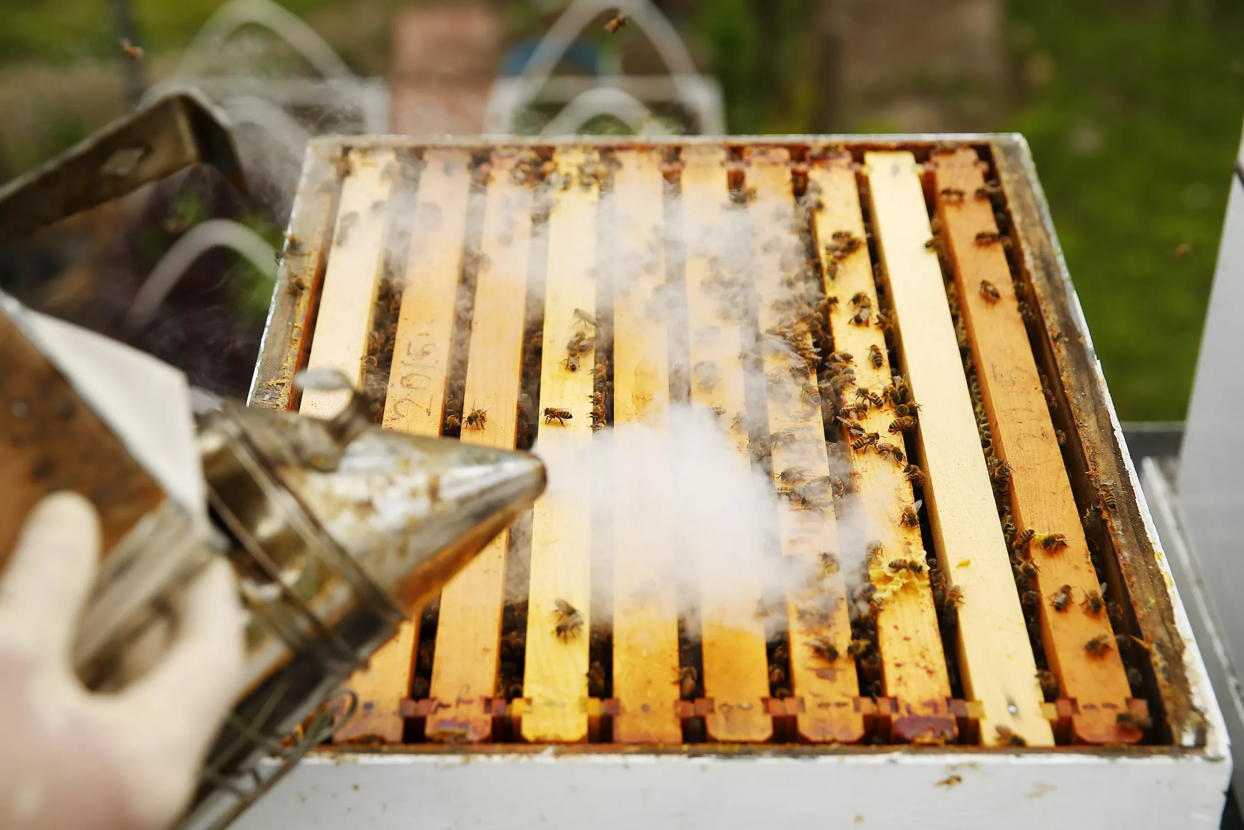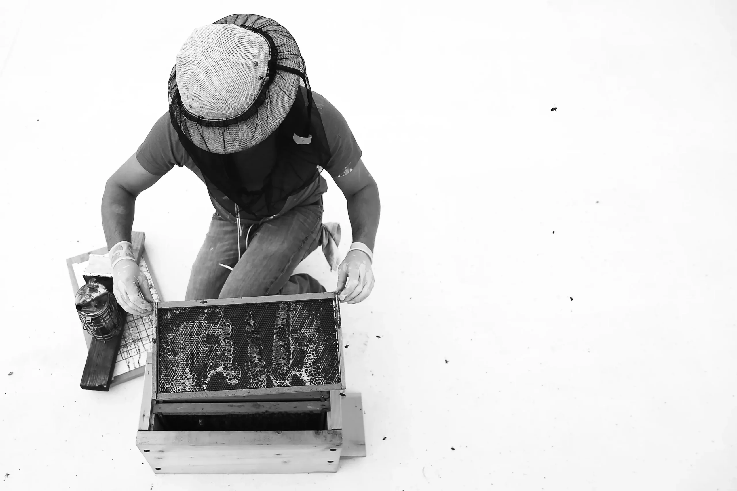 Ben burns his pine needles that he uses to calm the bees before inspecting the hives. Credit: CP Photo: Jared Wickerham