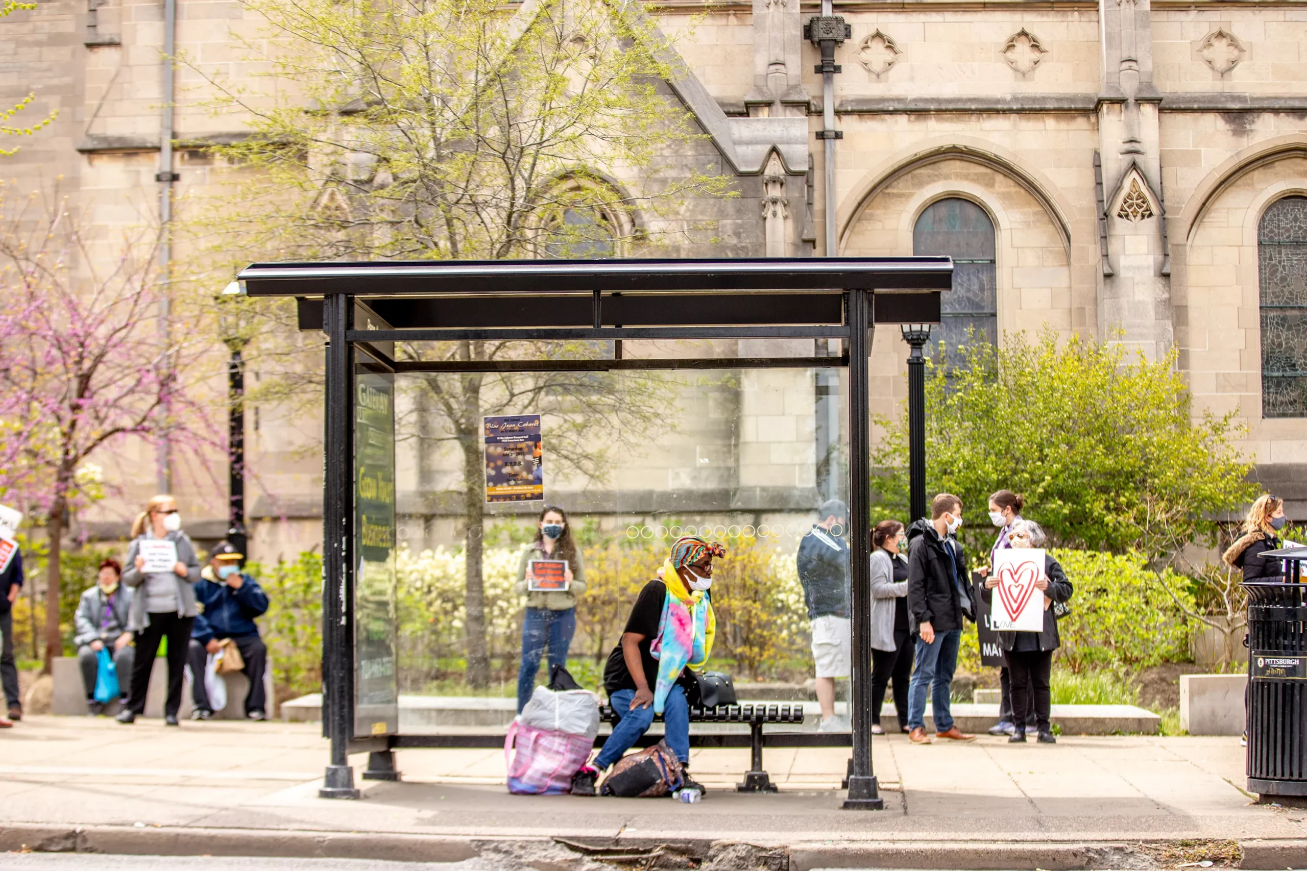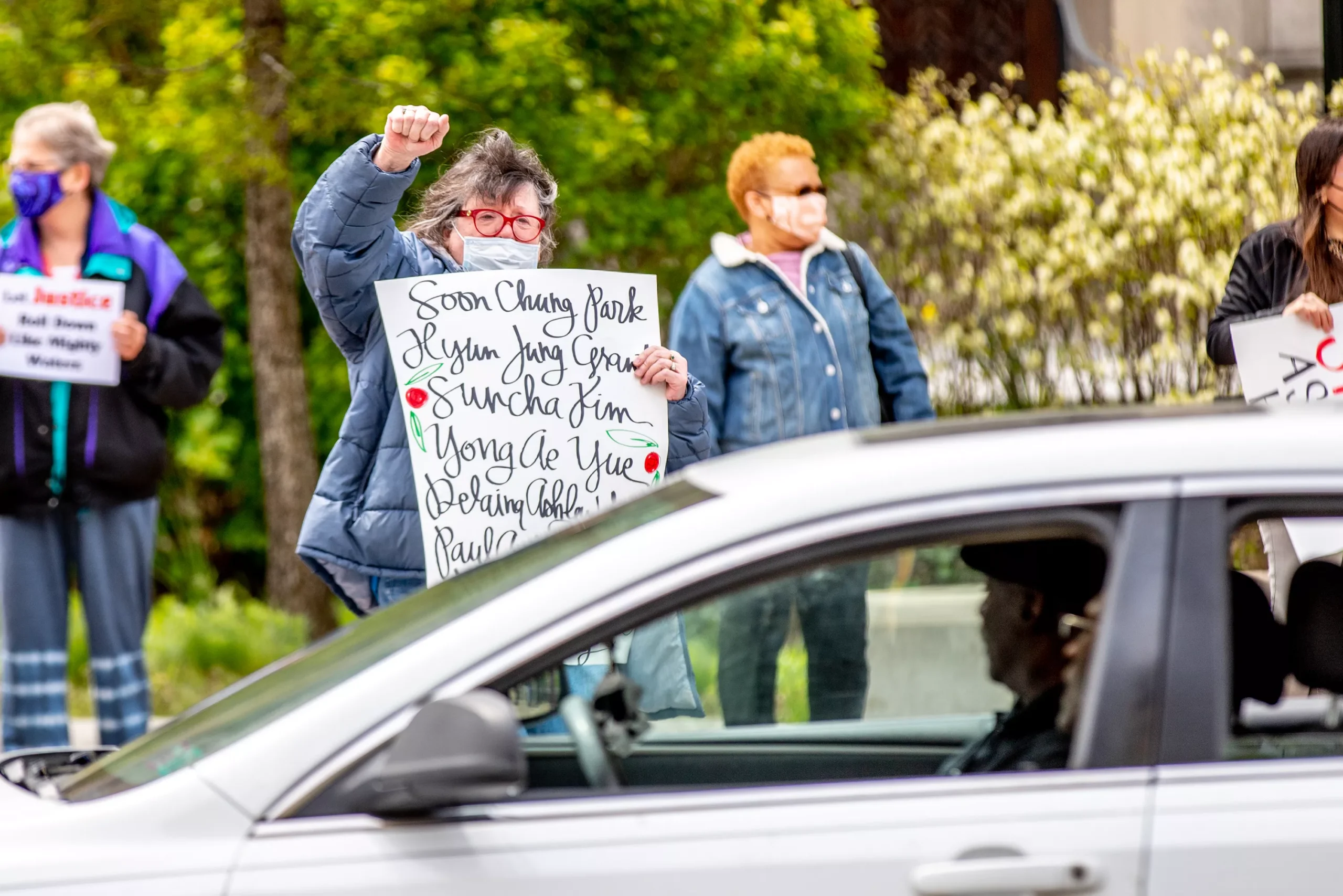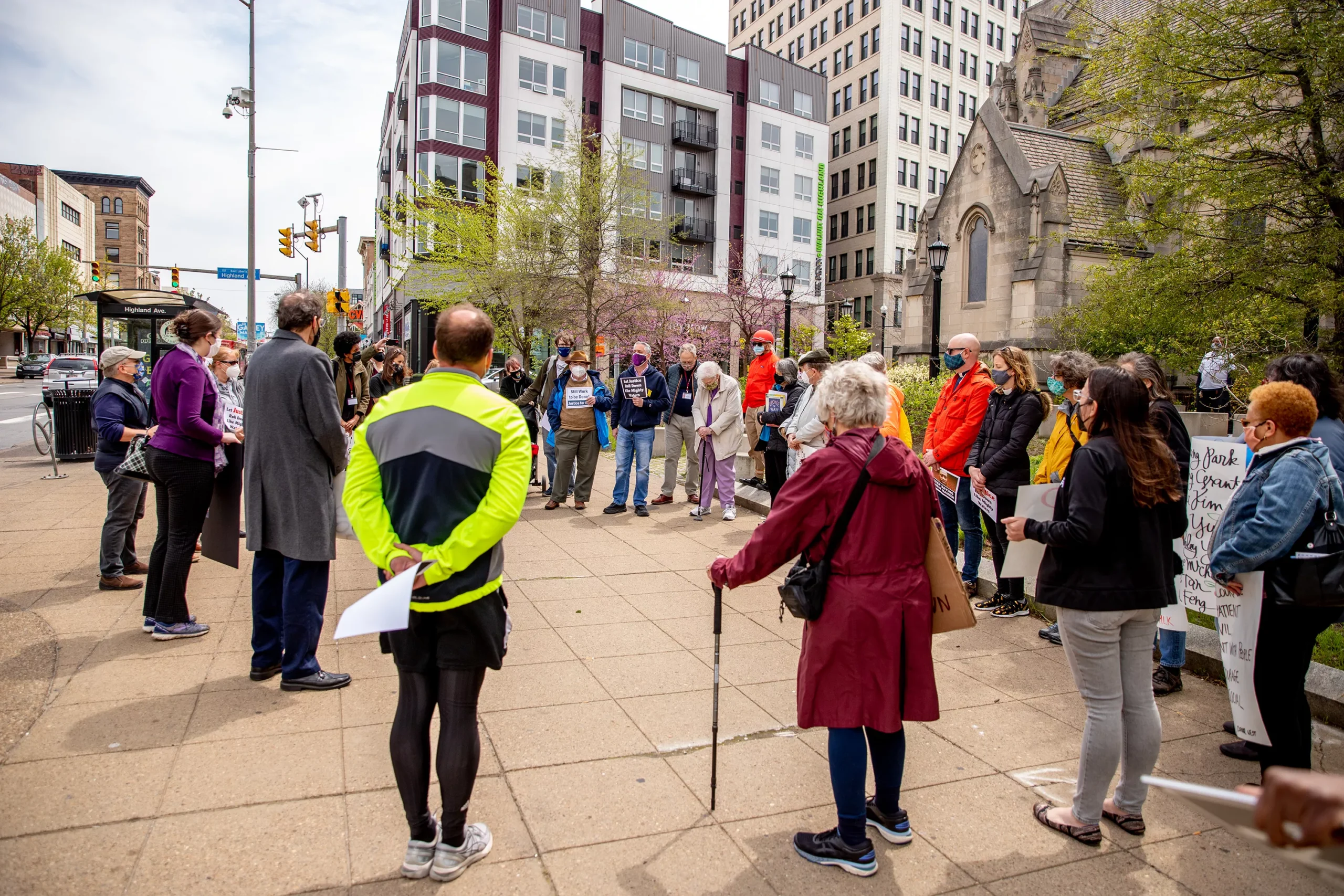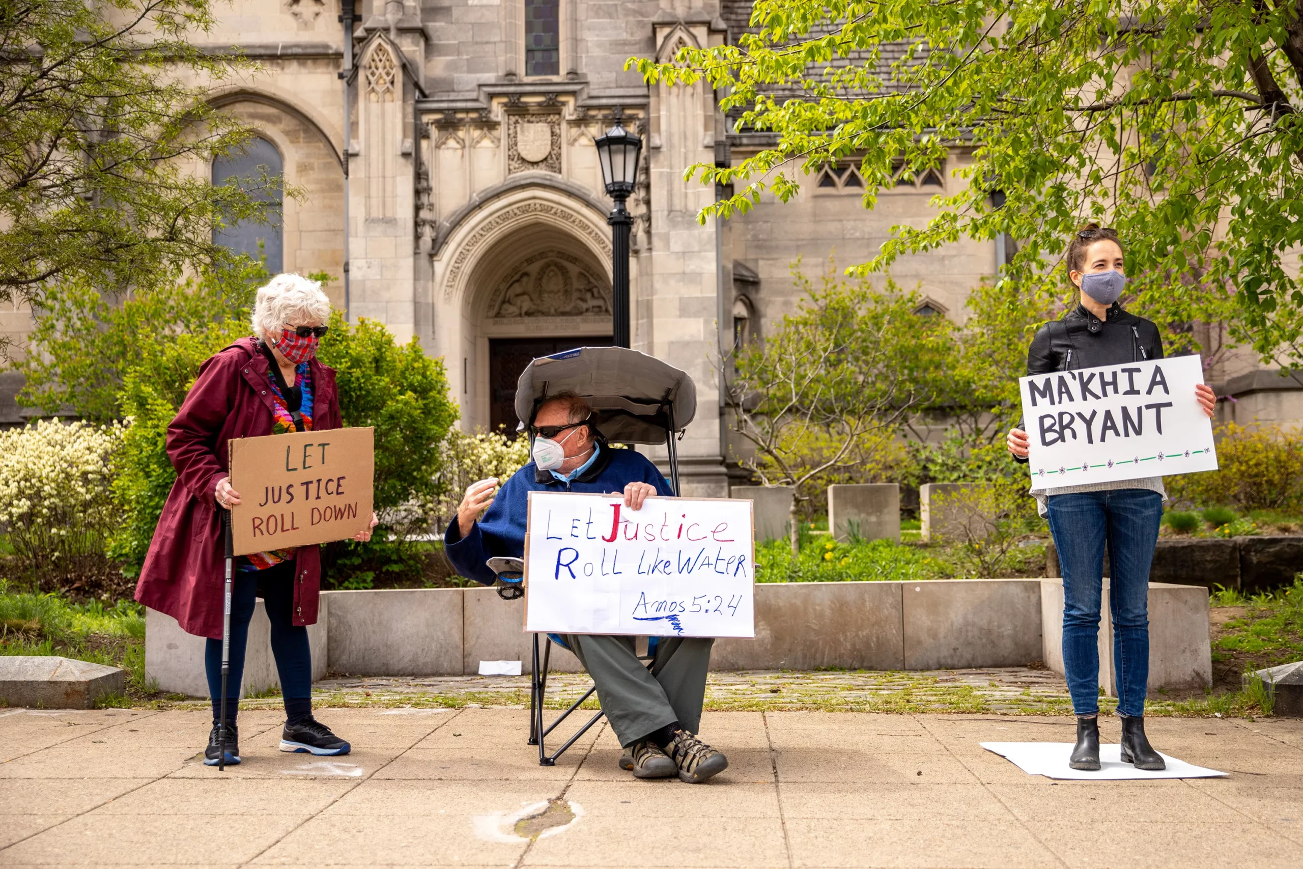 On Fri., April 23, dozens of people gathered outside of East Liberty Presbyterian Church for a Racial Justice Vigil. Among those participating were members of East Liberty Presbyterian Church, the Pittsburgh chapter of the National Black Presbyterian Caucus, Eastminster Presbyterian Church, as well as other community members. The protesters gathered in a line, holding up signs, and cheering as cars honked along South Highland Avenue. Bible verses, Martin Luther King Jr. quotes, and the names victims donned the signs of participants.